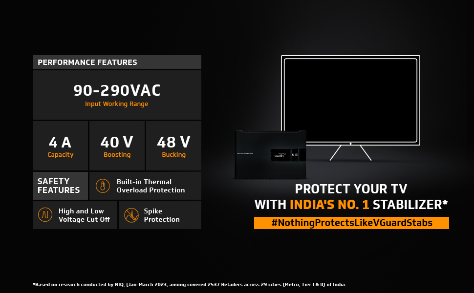 V-Guard Voltino Grand TV Stabilizer is an ideal, efficient, and reliable partner to ensure your TV viewing experience is smooth and unhindered. Designed to protect Smart TVs up to 203 cm (80) from undesirable voltage fluctuations and spikes, it can additionally support your set-top box as well as your Home Theatre System/Gaming Console. Its hosts of built-in safety features provide multiple layers of safety to the connected appliances. The thermal sensor function can sense excessive curre...