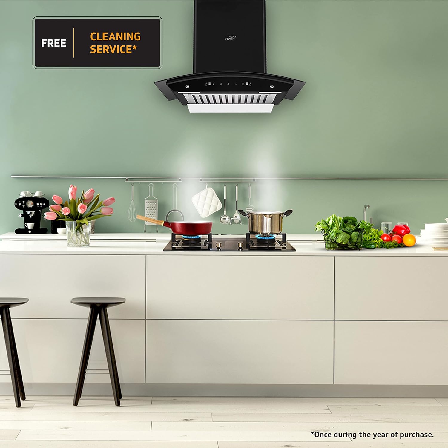 A10 BL180 Kitchen Chimney with 1300m³/hr Suction, Intelligent Auto Clean, Curved Glass, Baffle Filter, Motion Sensor Controls, Oil Collector Tray, LED Light (Black)