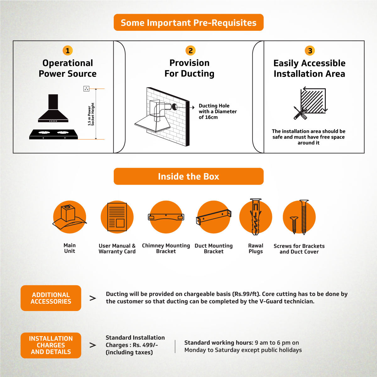 1 Number each of Unit Chimney, Duct Cover, Wall Mounting Bracket, User Manual/Warranty Card, Screws and Rawal Plugs