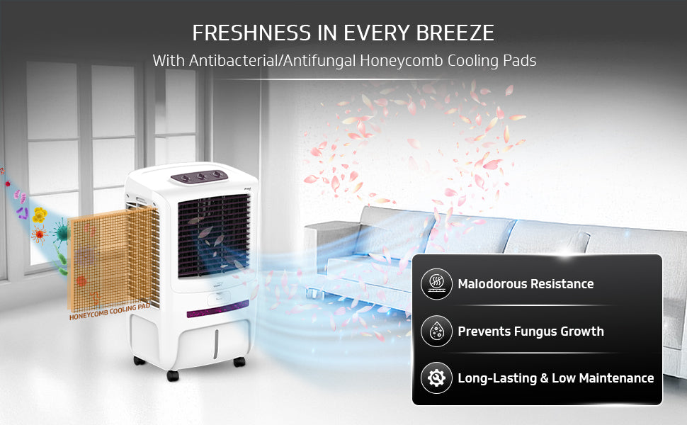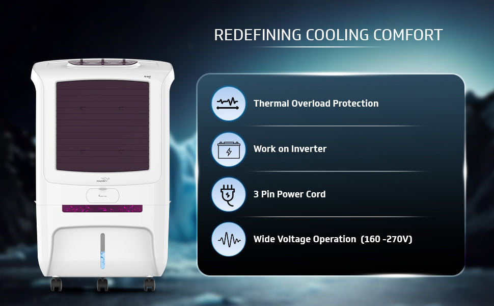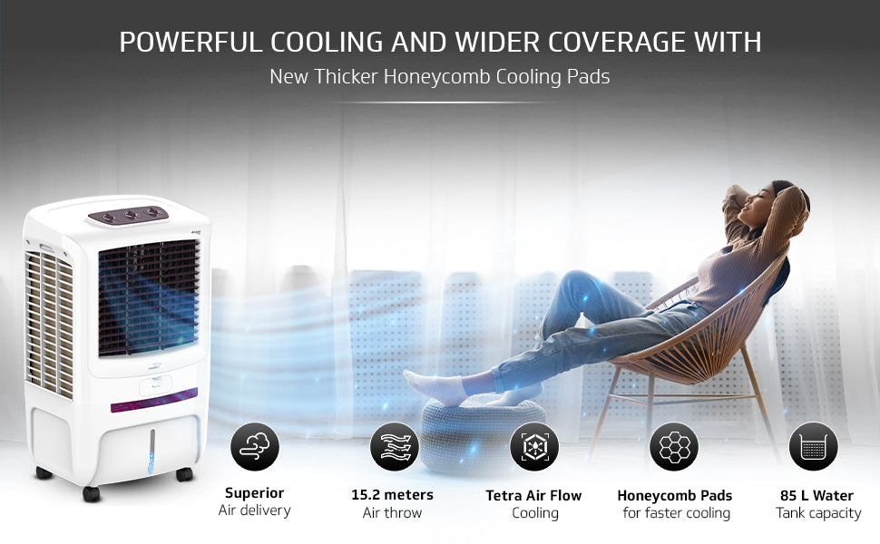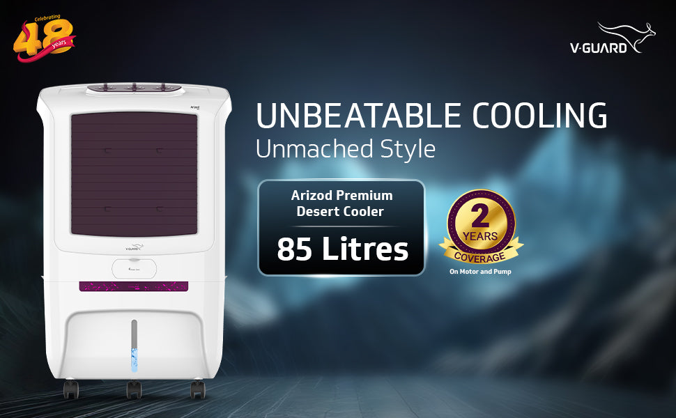 Experience superior cooling with the V-Guard Arizod F85 Premium Desert Air Cooler, backed by a 2-year warranty for peace of mind. Featuring a concealed pump, this cooler ensures reliable performance and durability. With an impressive air delivery of 4700 m³/h and 4D air circulation, enjoy efficient and powerful cooling throughout your space. The high-density cooling pads, along with uni-drip flow water distribution and a water inlet door, enhance the cooling experience. The corrosion-resis...