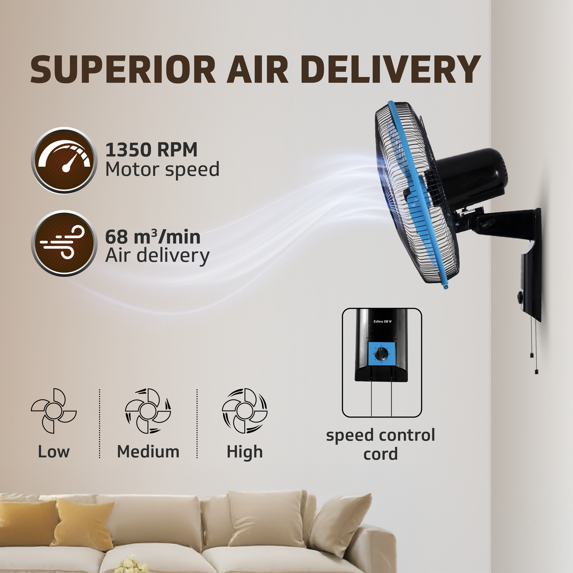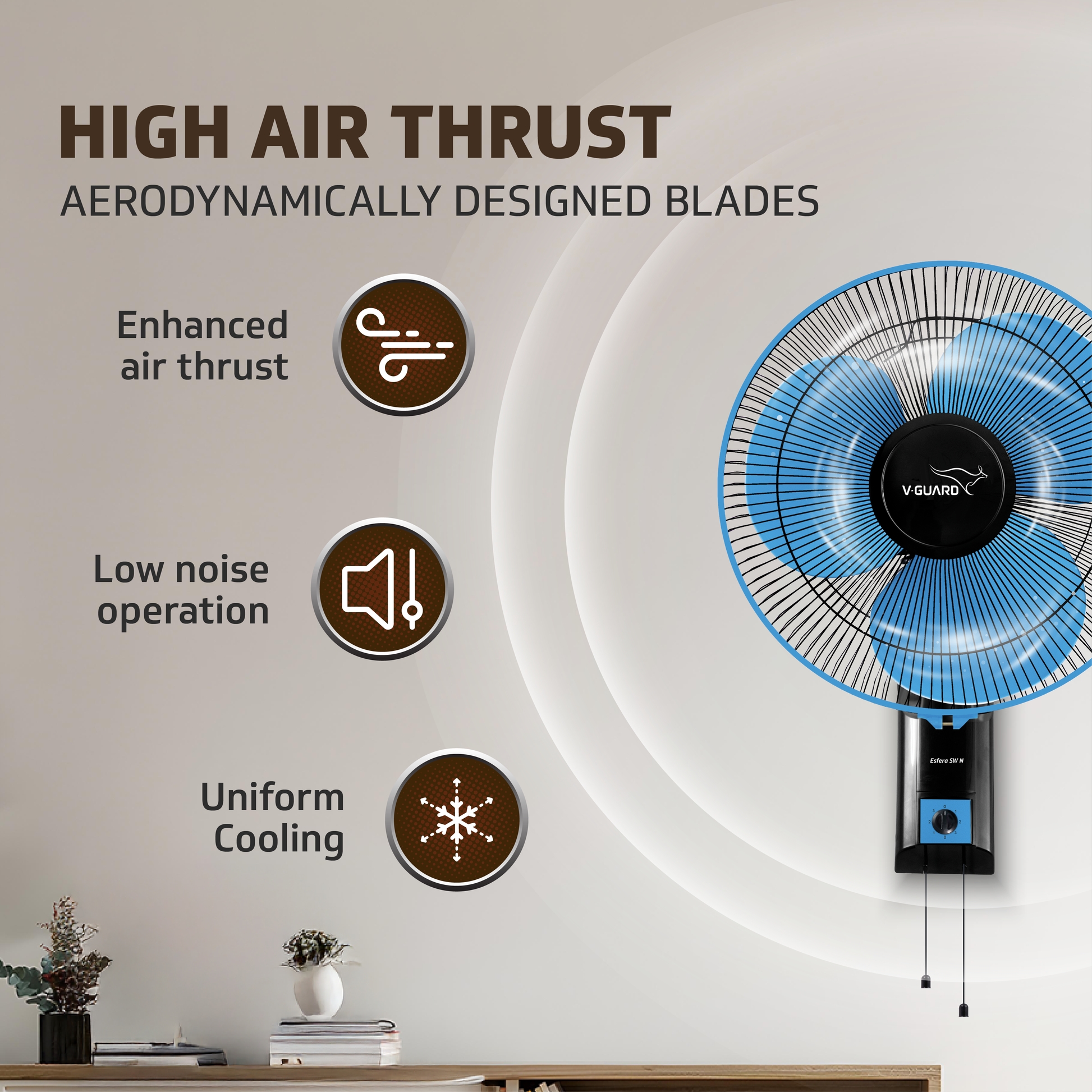Meet the V-Guard Esfera SW N Wall Fan, where cooling meets convenience. This wall fan is designed to bring a refreshing breeze to your space with its impressive features and thoughtful design. With its pull cord control, you can effortlessly adjust the speed of the fan to three different settings, allowing you to personalise the airflow according to your comfort preferences. The robust and rust-resistant ABS body ensures durability, making it a reliable companion for years to come. Plus, t...