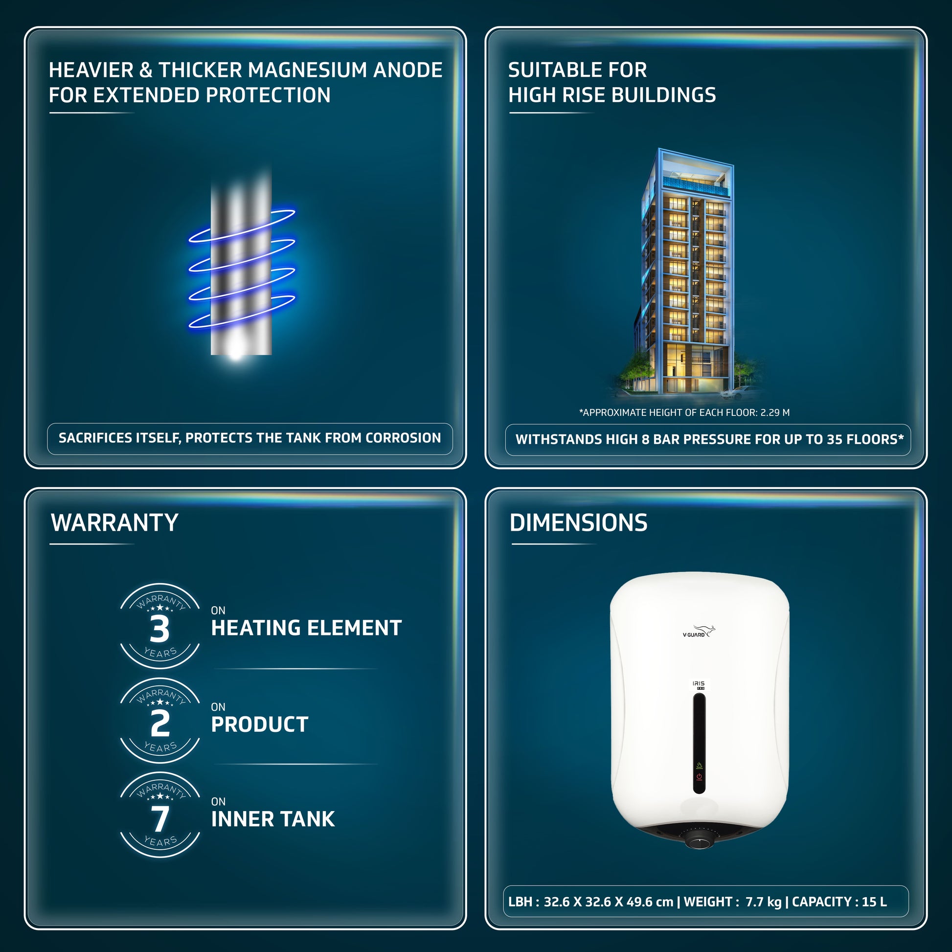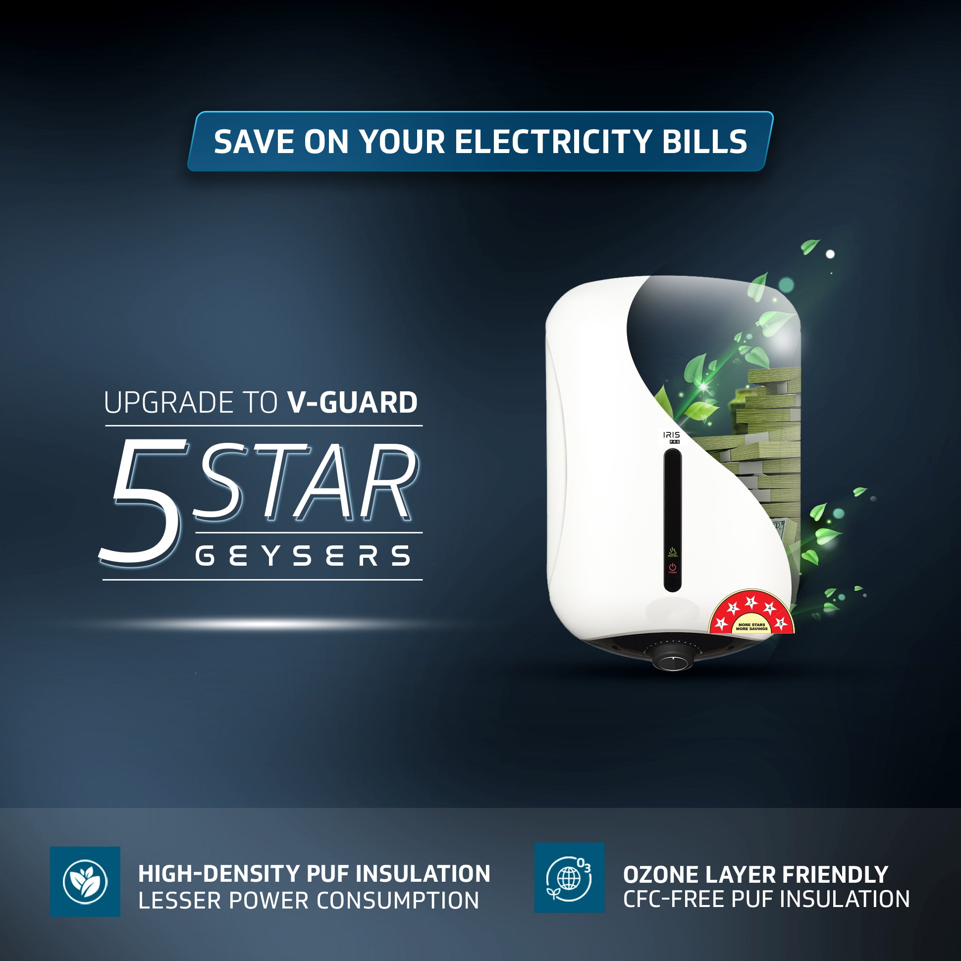 Enhance your bathroom decor with elegance. Presenting Iris Pro Series, a range of storage water heaters from V-Guard. Stylish and efficient, these water heaters can be mounted vertically and is available in 10, 15 and 25 Litre capacities. It comes to you in an attractive dual tone of white & black colour, making this the perfect pick for you.