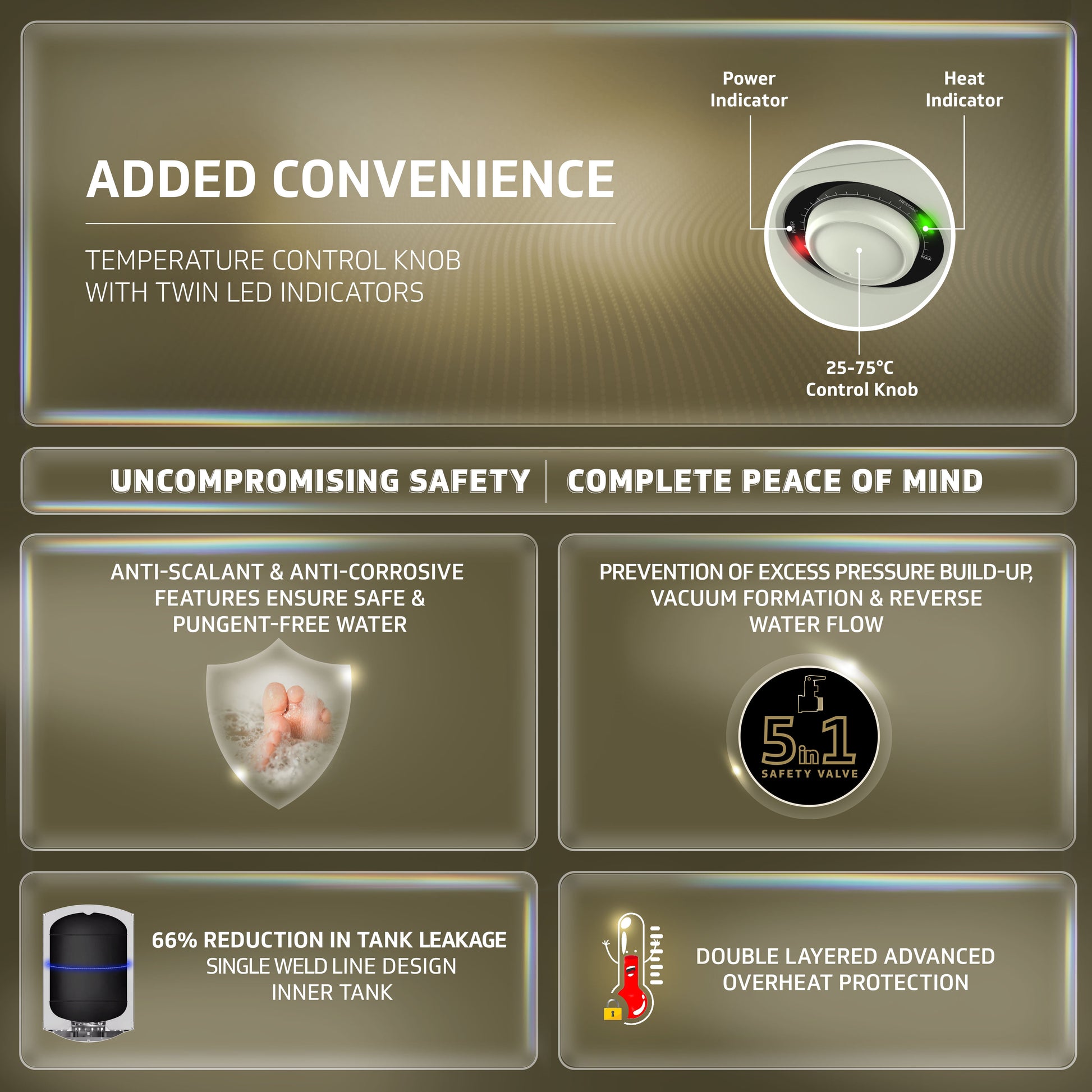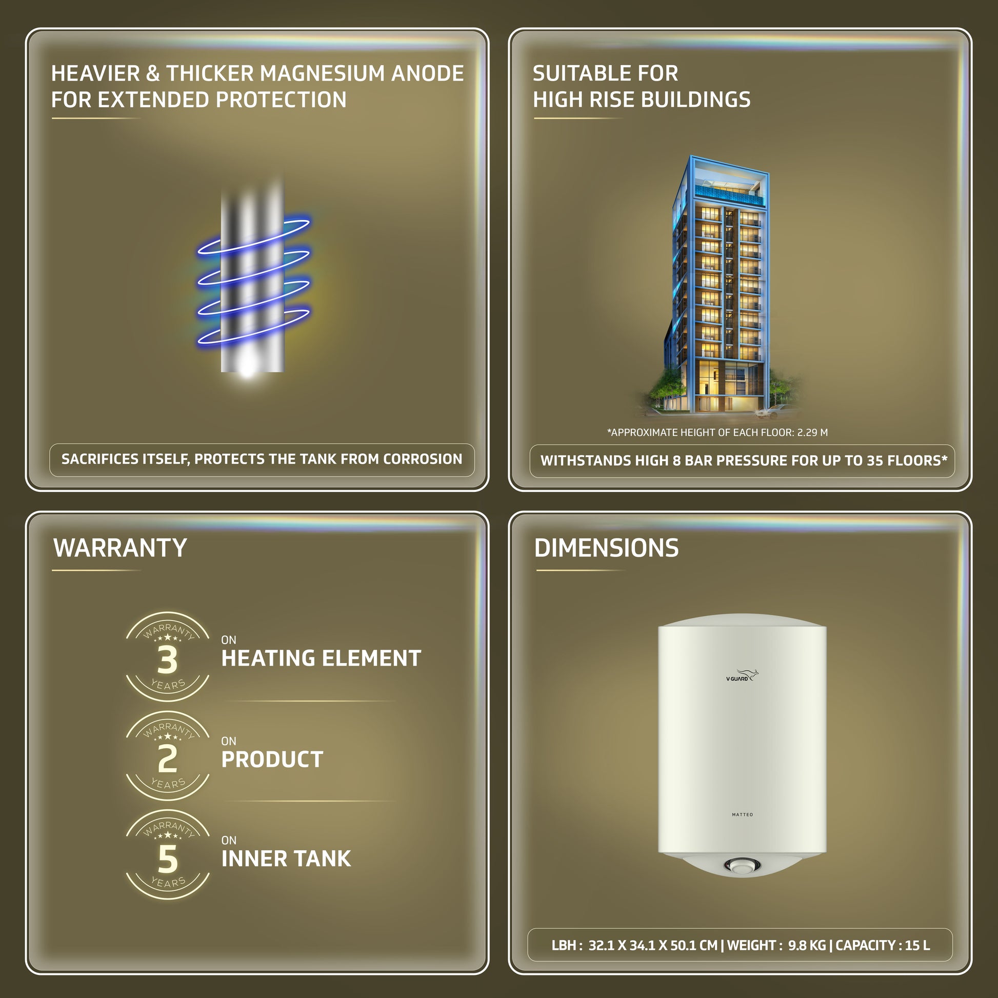 Give your bathroom an air of splendor with the V-Guard Matteo Series Water Heaters. It offers a pleasant mix of efficiency and elegance. The modish design, along with long-lasting performance, higher energy savings, and enhanced safety features, make this an ideal choice for modern homes. The V-Guard Matteo Series Water Heater features extra thick and high-density PUF insulation that helps to maximize heat retention, thus ensuring that the water inside the tank remains heated for a longer ...