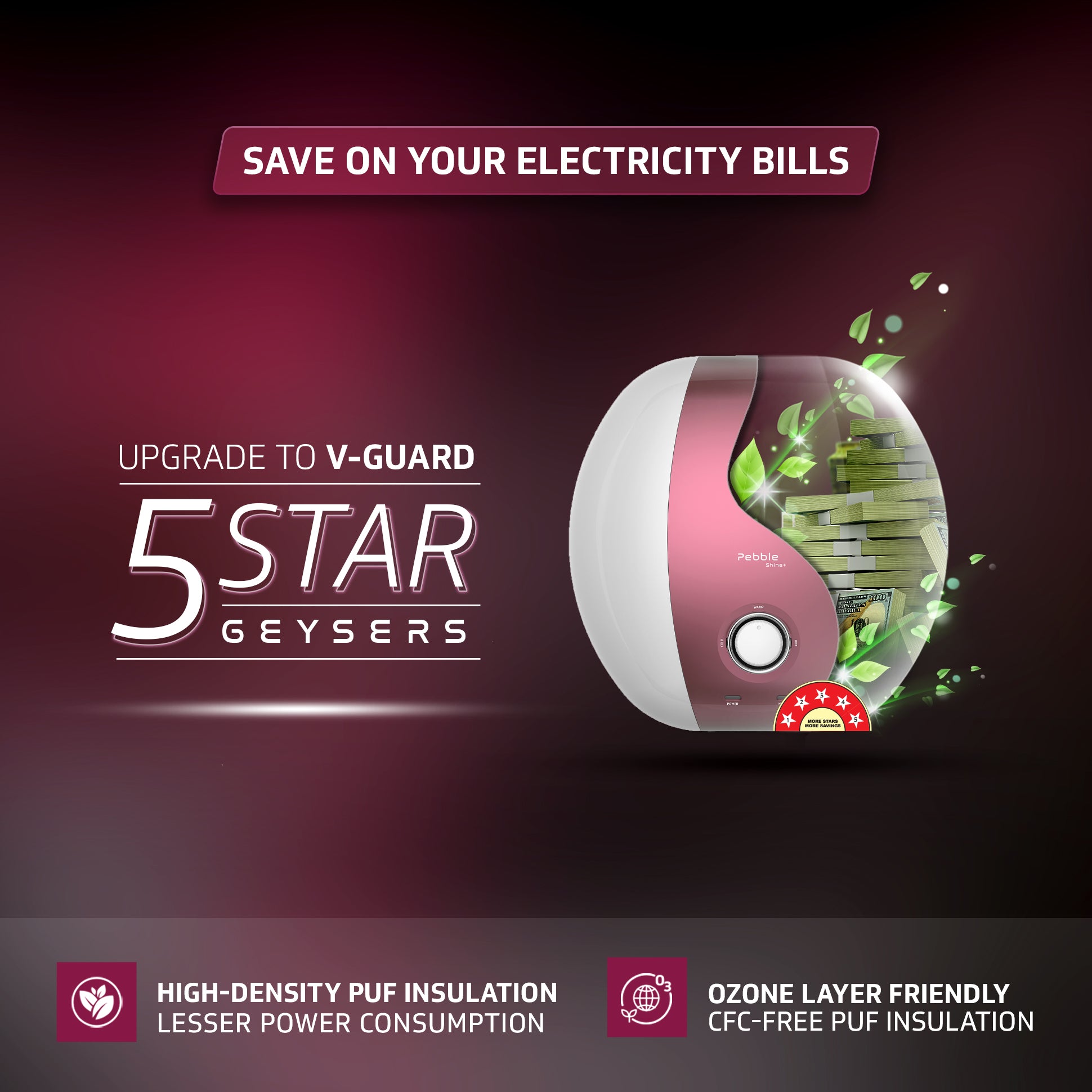 Elate elegance and class to your bathroom interior with a superior water heating experience by V-Guard Pebble Shine Plus Water Heaters. The Pebble Shine Plus Water Heater has bagged 5-Star Rating from BEE, and is known for its high energy efficiency. Its thick and high-density PUF insulation maximizes heat-retaining capacity and ensures water inside the tank remains heated for a longer duration. It benefits the users greatly by reducing energy consumption and lowering their electricity bil...
