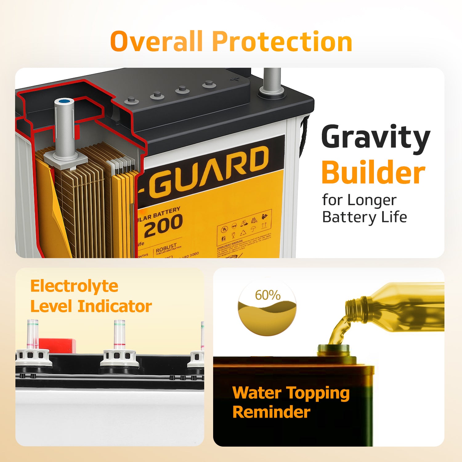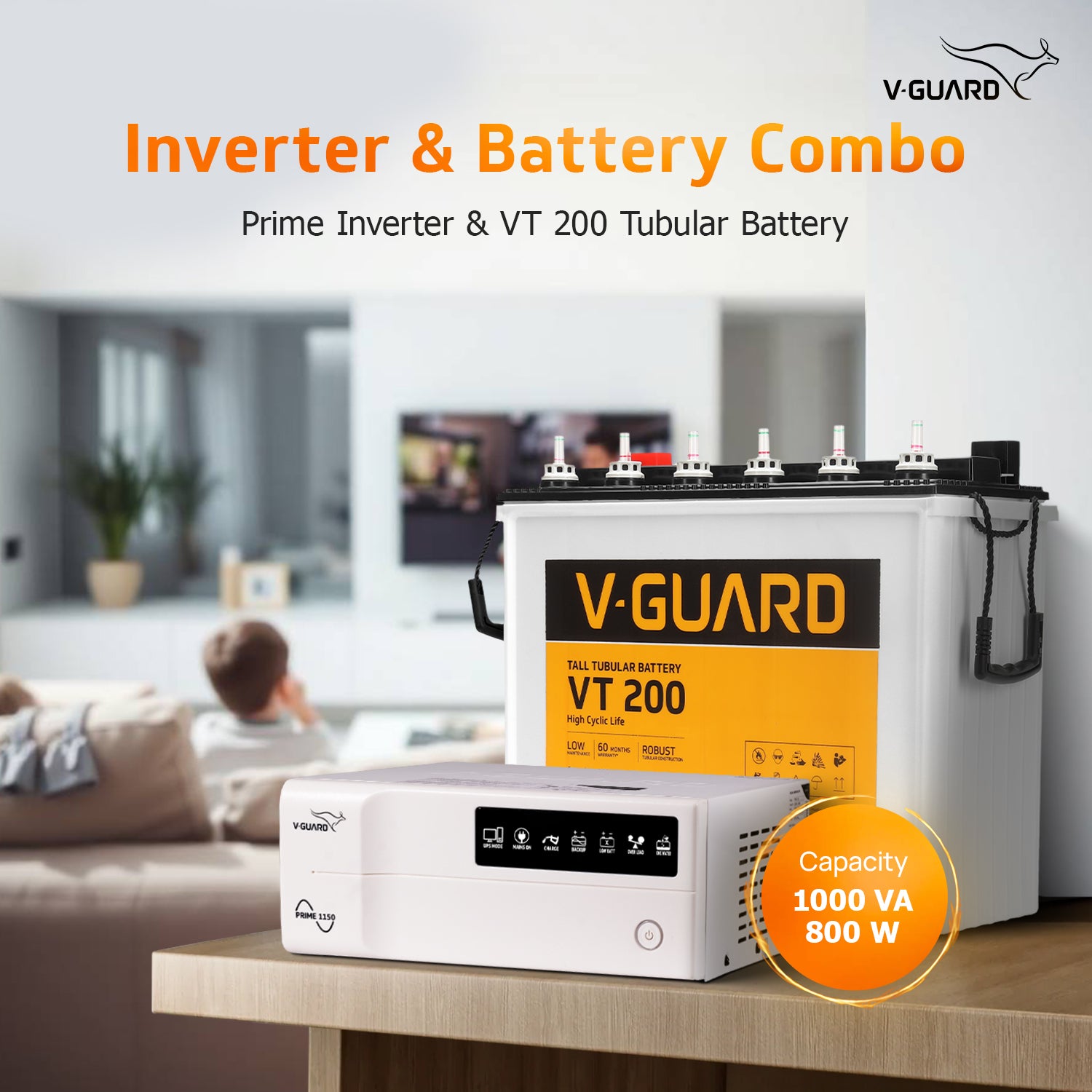 Introducing the V-Guard Inverter & Battery Combo, a powerful and reliable solution for homes, offices, and shops. The 1150 Pure Sine Wave Inverter, with a capacity of 1000 VA and a peak load of 800Watts, is paired with a Tall Tubular VT 200 Battery equipped with Tubular Plate technology for enhanced life and performance. This combo effortlessly powers a 250-liter fridge, a 40" LED TV, three fans, three tube lights, and five 15W LED bulbs. The battery's rugged construction ensures resil...