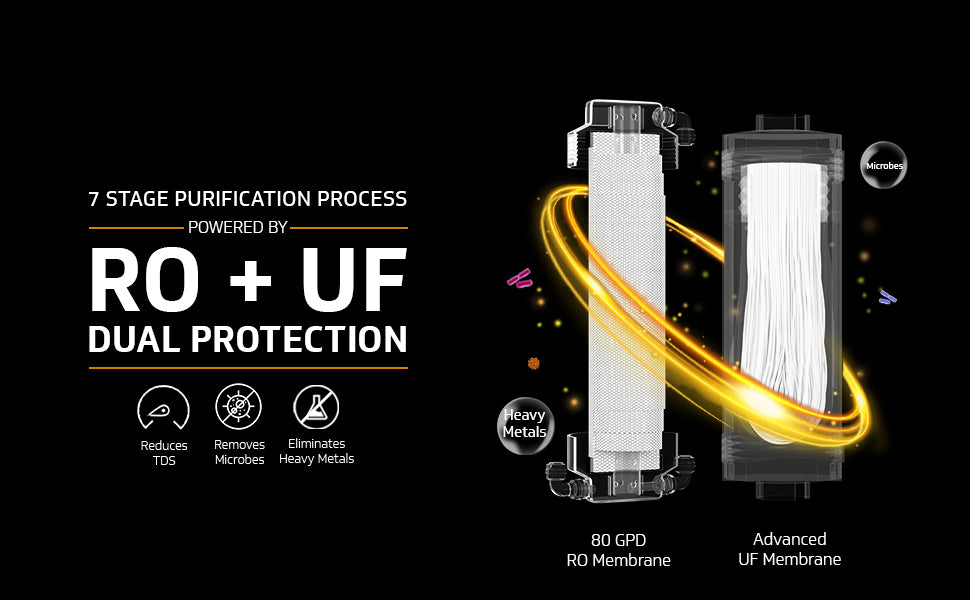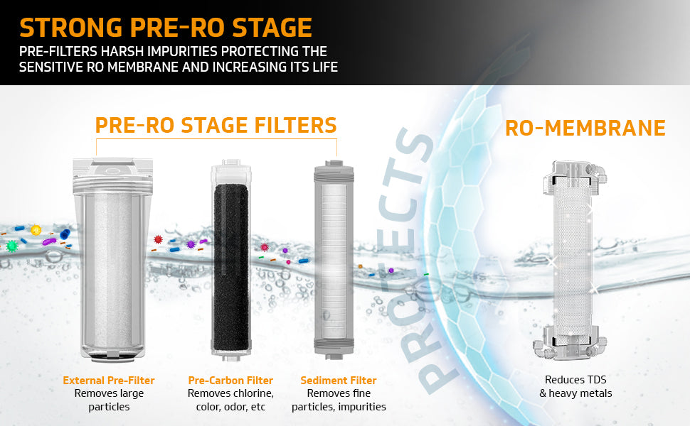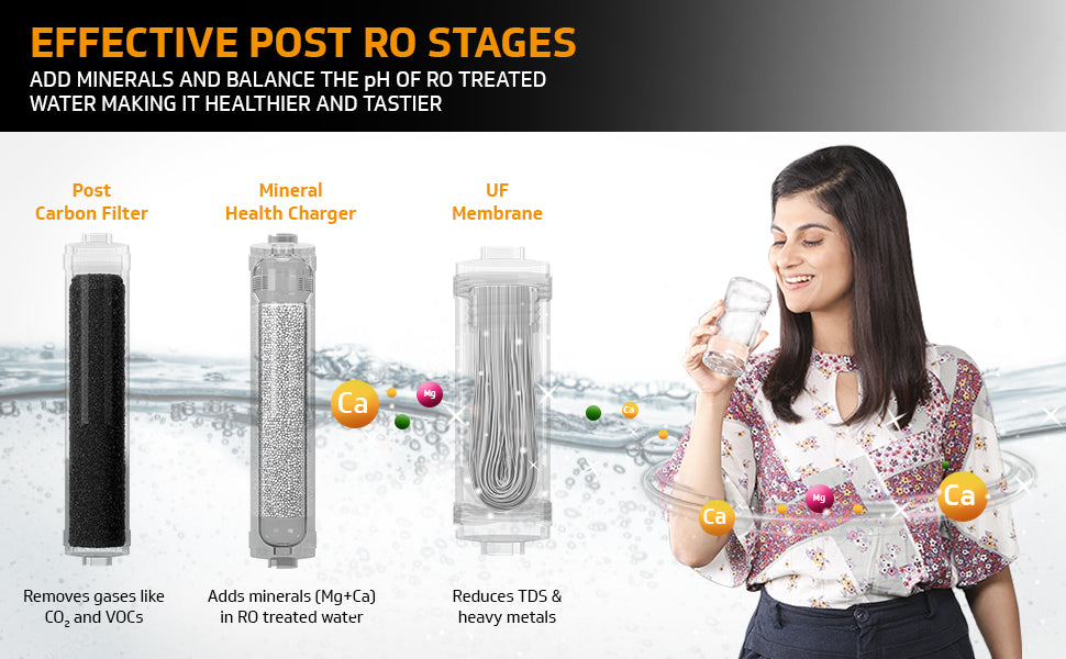 A strong Pre-RO stage comprising external pre-filter, anti-microbial pre-carbon GAC filter and sediment filter pre-treats the water before it enters the sensitive RO membrane thus protecting it and enhancing its life. In the Post-RO Stage an extra layer of protection is provided through Next generation UV chamber or Hollow Fiber Advanced UF Membrane, while the unique Mineral Health Charger and Alkaline Health charger add essential minerals such as Calcium and Magnesium and improve the pH levels of the RO treated water thus providing you mineral enriched natural tasting water.