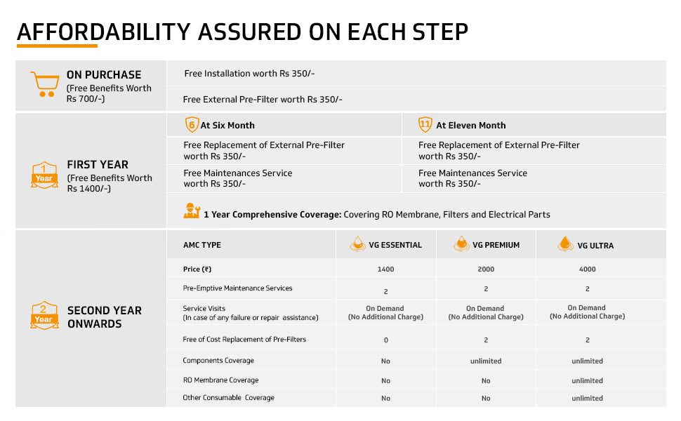 Input Water TDS should not exceed 2000ppm (maximum limit) while its pressure should be between 5 to 40 psi. If it is not so, you will require additional solutions otherwise it will affect your product’s performance. These additional solutions can be purchased from V-Guard technicians at extra cost.