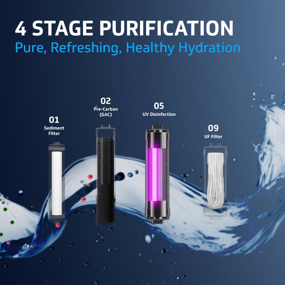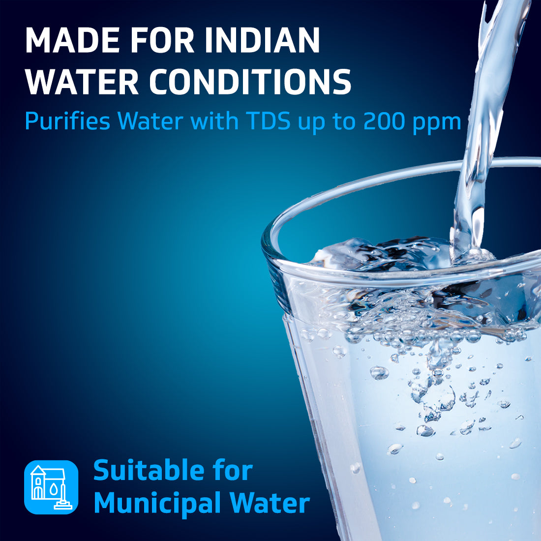 A: Our UV UF models are suitable for municipal water but are not suitable for tanker/borewell water. They can be used for water with TDS up to 200 ppm. For TDS greater than 200 ppm, please choose our RO Water Purifiers.