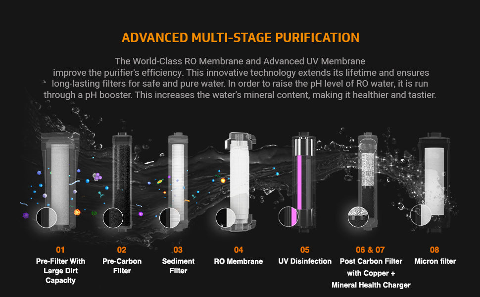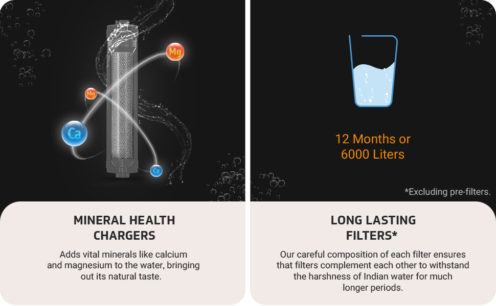 A strong Pre-RO stage comprising external pre-filter, anti-microbial pre-carbon GAC filter and sediment filter pre-treats the water before it enters the sensitive RO membrane thus protecting it and enhancing its life. In the Post-RO Stage an extra layer of protection is provided through Next generation UV chamber or Hollow Fiber Advanced UF Membrane, while the unique Mineral Health Charger and Alkaline Health charger add essential minerals such as Calcium and Magnesium and improve the pH levels of the RO treated water thus providing you mineral enriched natural tasting water.