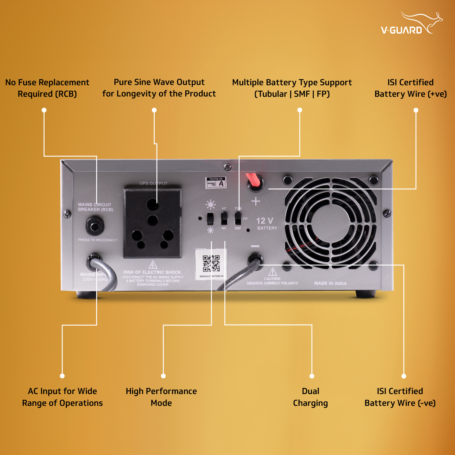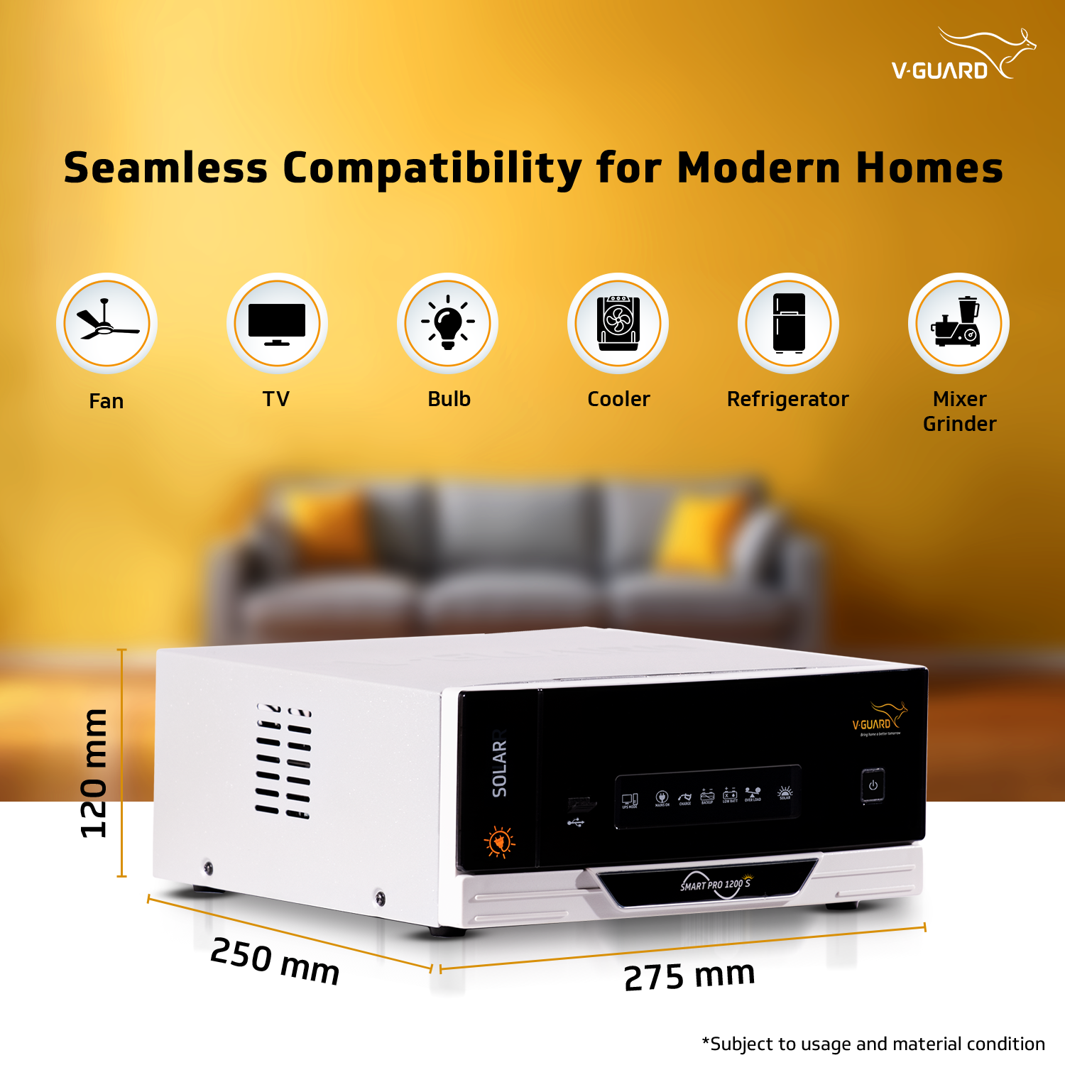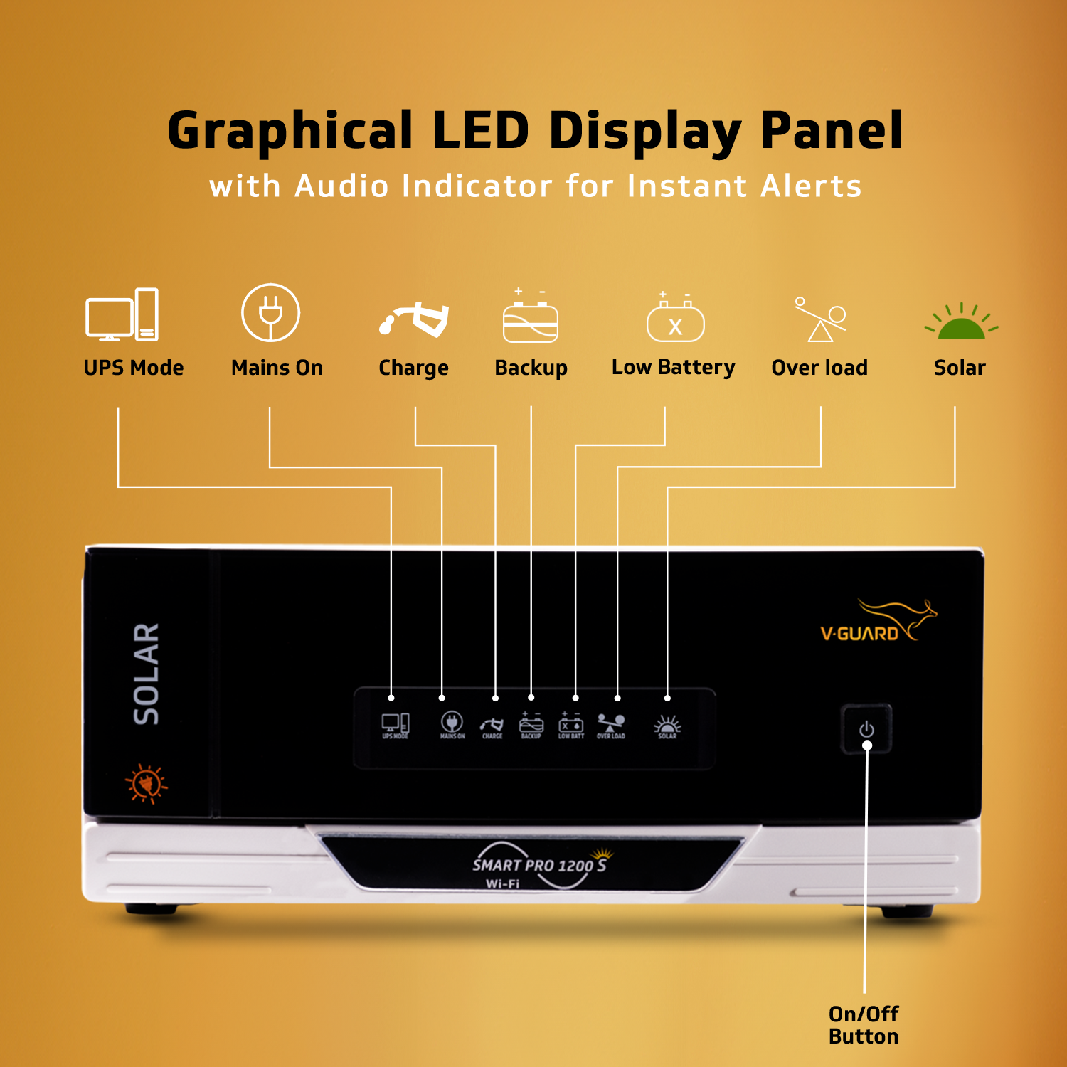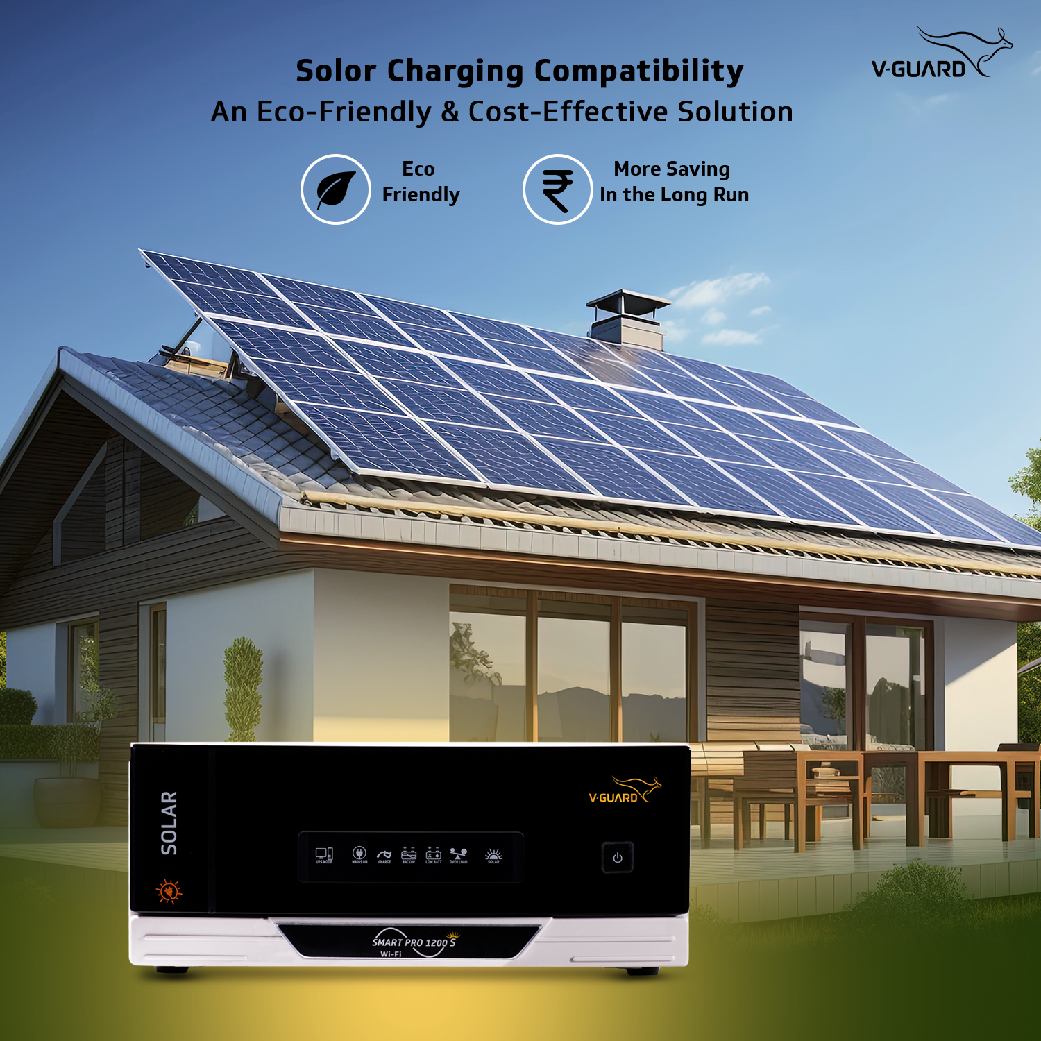 V-Guard Smart Pro 1200 S is the first advanced Digital-UPS (DUPS) in the market with solar compatibility (Solar Inverter) that works as per the customer needs and can be controlled using the V-Guard Mobile App. The features on the app include Appliance mode to run loads up to 1000 W (Electric Iron, Coffee maker, Toaster etc.), faster battery charging through Turbo Charge Mode, mute/unmute the buzzer, User Selectable Output, check battery time, check and increase the back-up time, data on t...