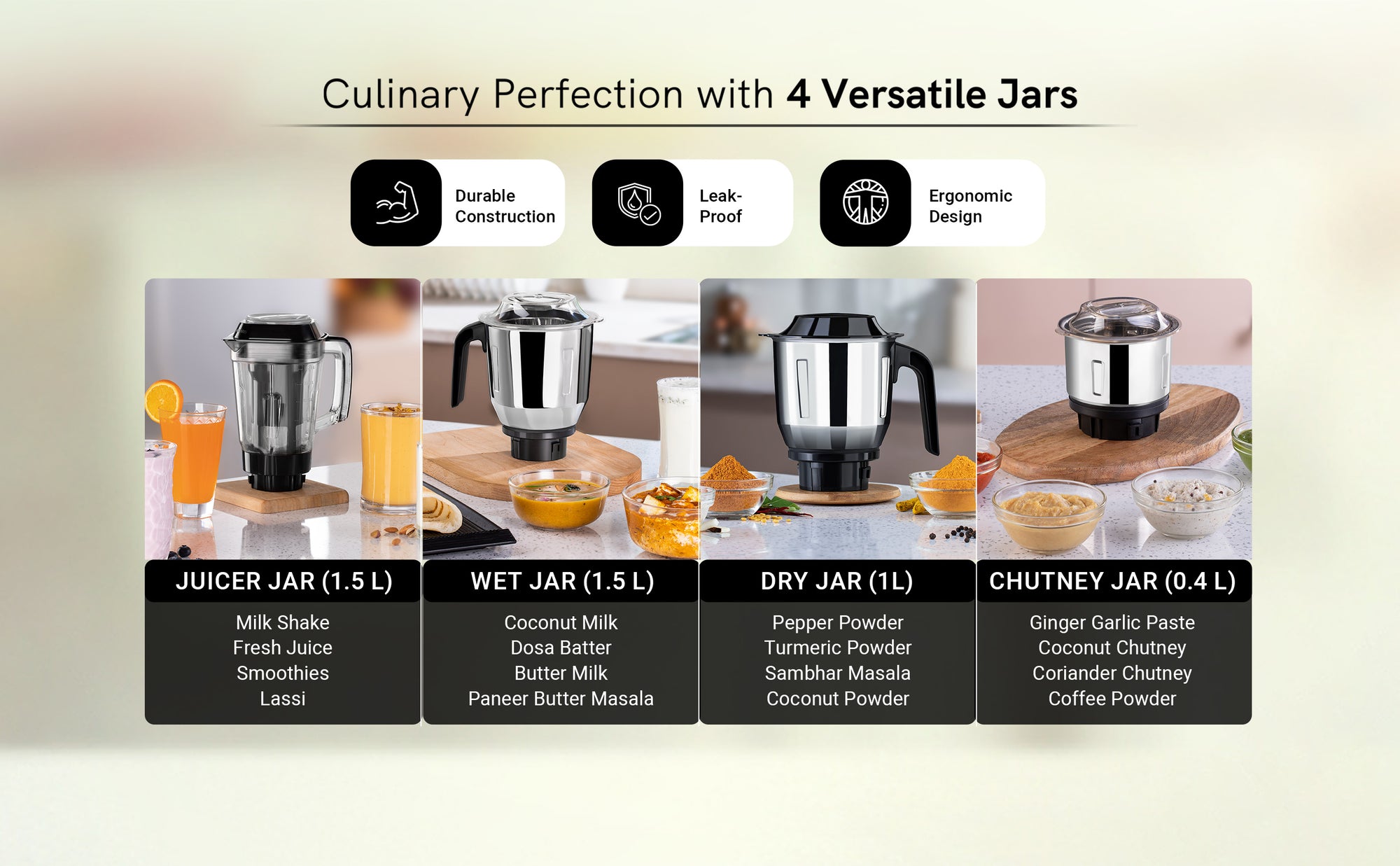 One number each of Mixer Unit, Juicer Jar, Wet Jar, Dry Jar, Chutney Jar and Usermanual Cum Warranty Guide.