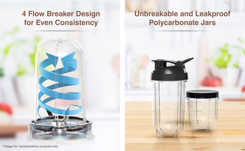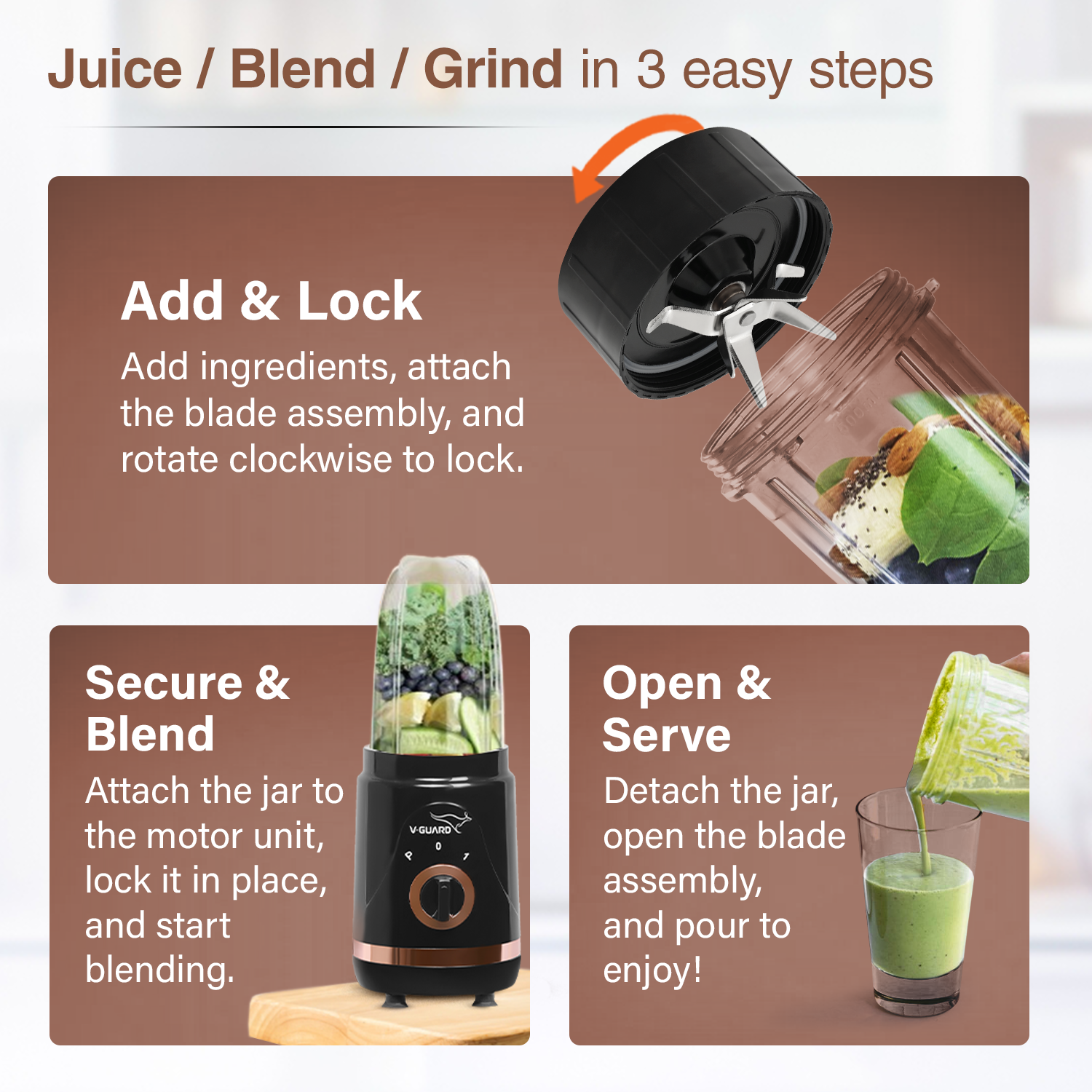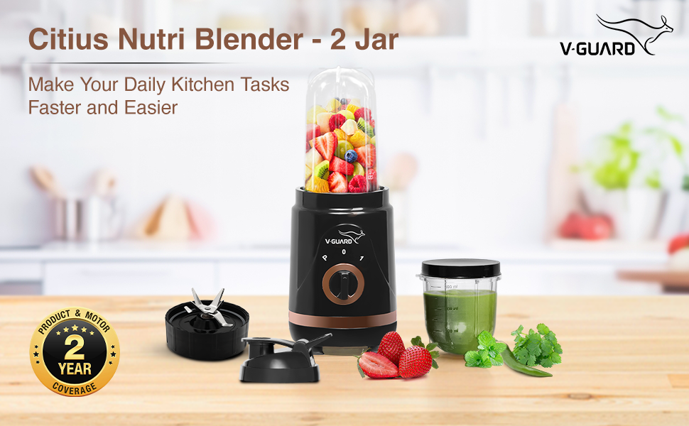 Versatile. Fast. Sleek. — V-Guard's Citius Nutri Blender is the all-in-one solution for effortless juicing, blending, and grinding. Powered by a 400 W copper motor with speeds of up to 22,000 RPM, it quickly creates smooth chutneys, thick smoothies, and finely ground spices. The blender comes with 2 leakproof, unbreakable polycarbonate jars, each featuring measurement markings for precise blending. This appliance comes with versatile lids—1 storage lid & 1 sipper lid, allowing you to s...