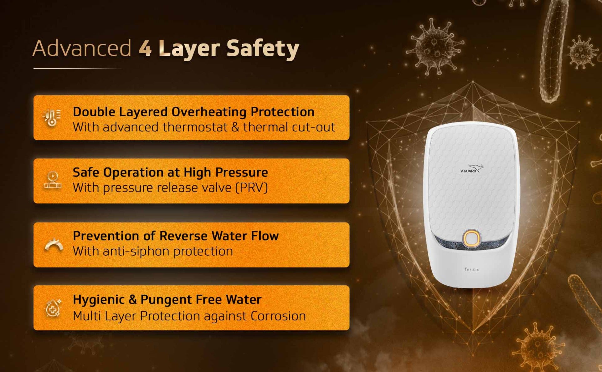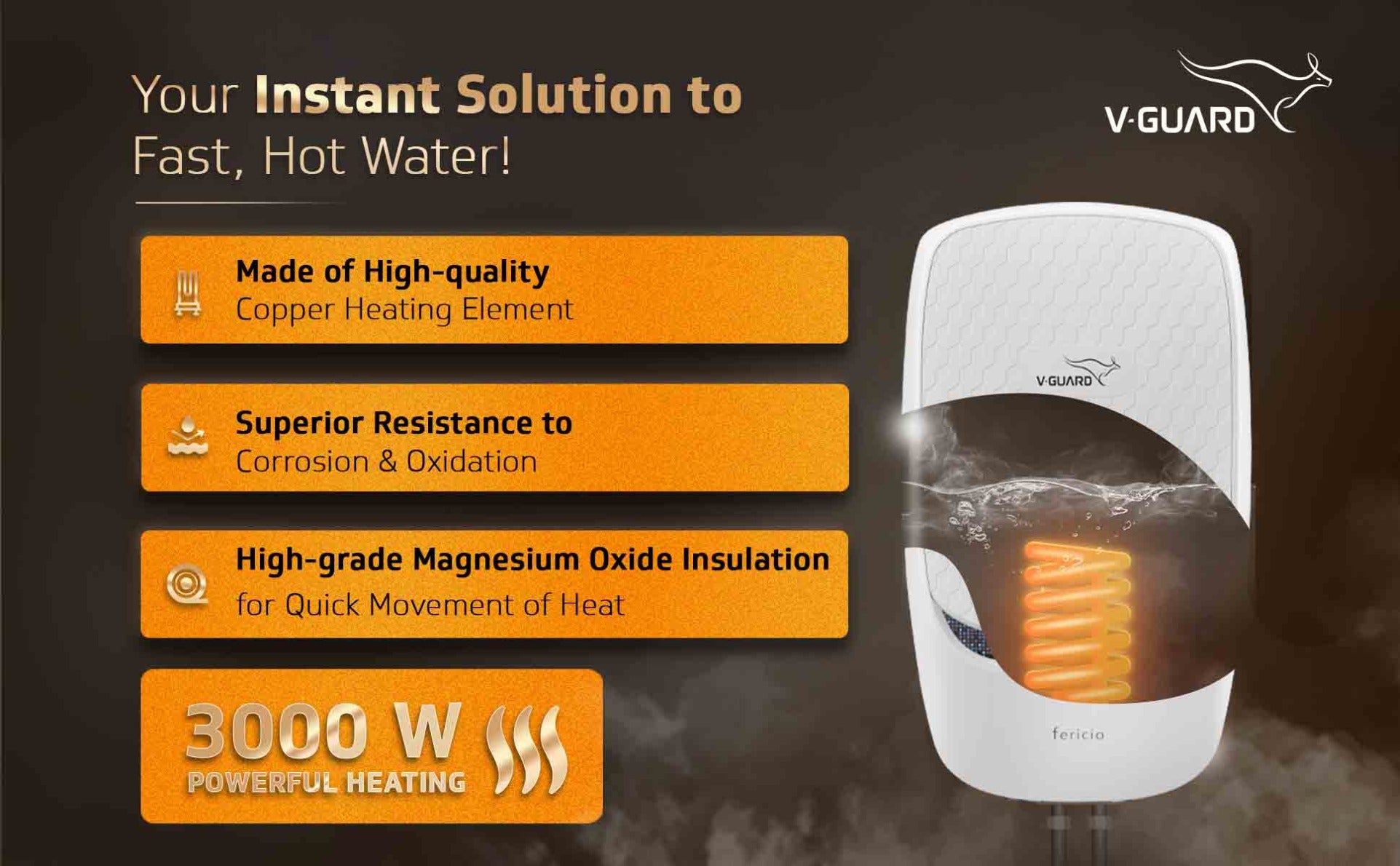 Your search for a highly powerful instant heating geyser ends right here. V-Guard brings to you the Fericio 3 Litre Water Heater, an elegant and compact solution for your household hot water requirements. In our current fast paced surroundings, where everyone craves for swift, stylish and energy efficient water heaters, V-Guard Fericio would be the perfect choice, ticking all these boxes. This elegant and compact, white-coloured geyser that also sports a colour display panel to indicate op...