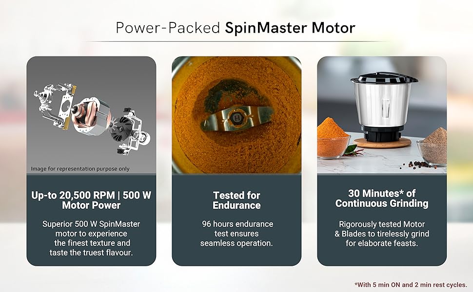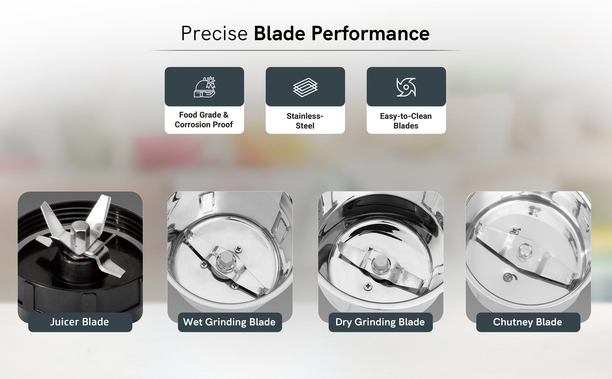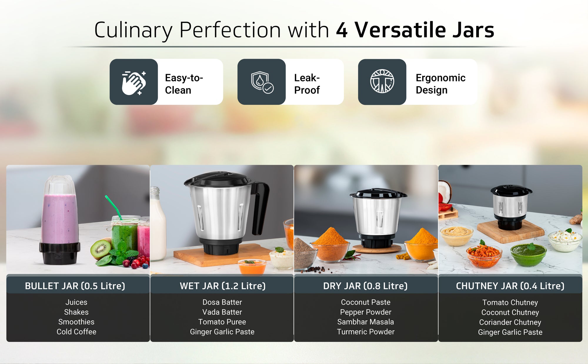 1 main unit assembly | 1.2 L Wet grinding jar with PP lid | 0.8 L Dry grinding jar with PP lid | 0.4 L chutney jar with PP lid | 0.5 L Nutri Jar | User Manual