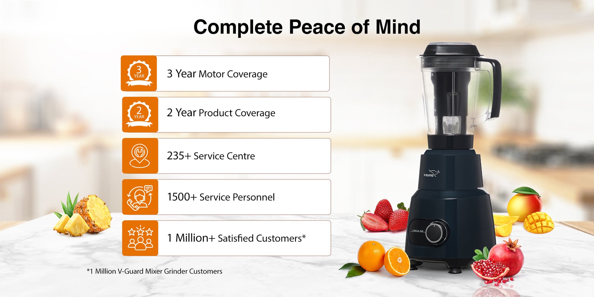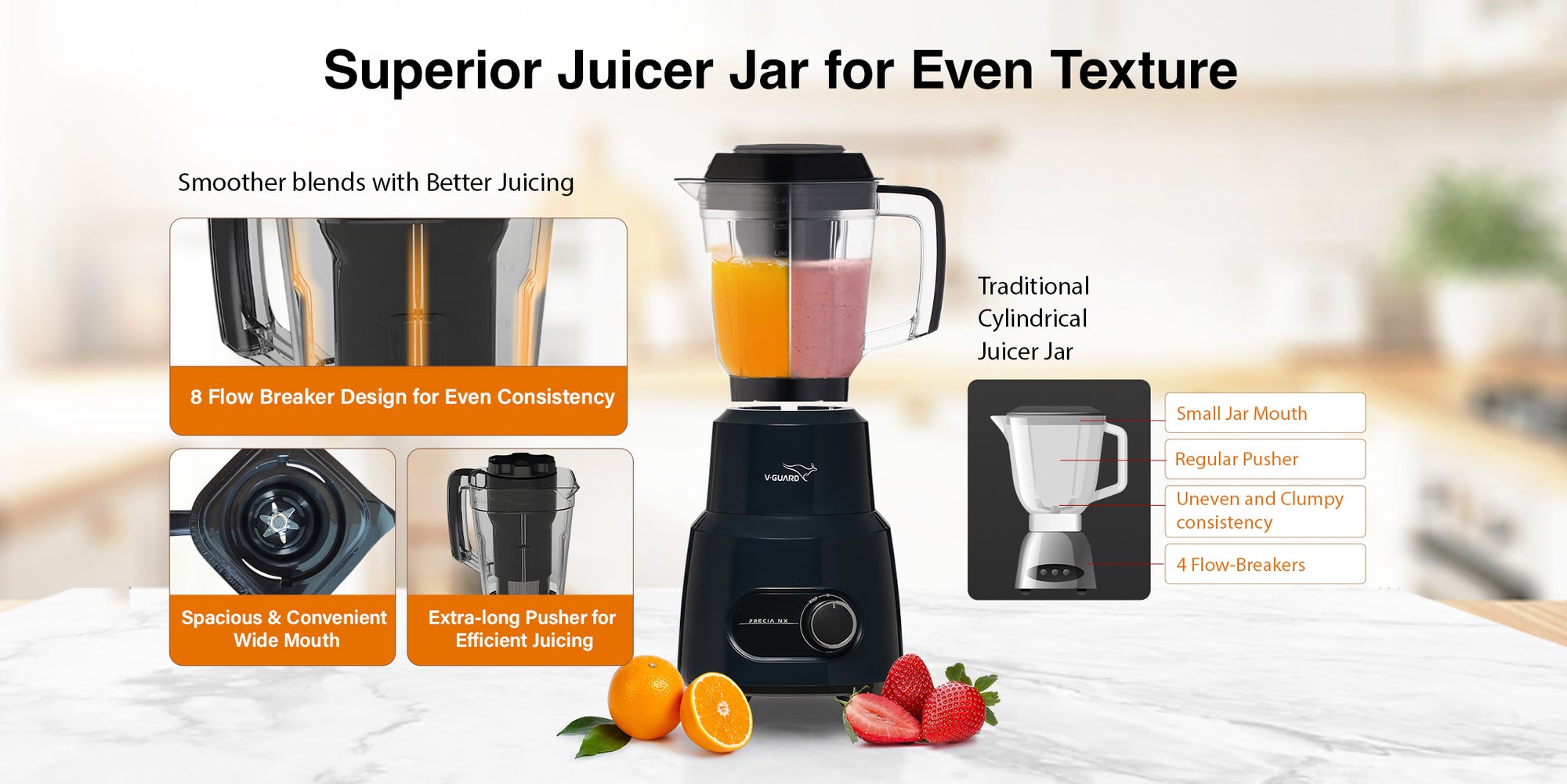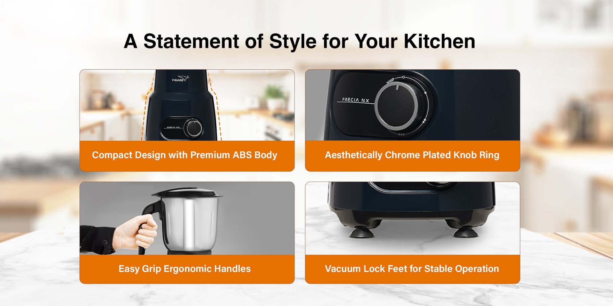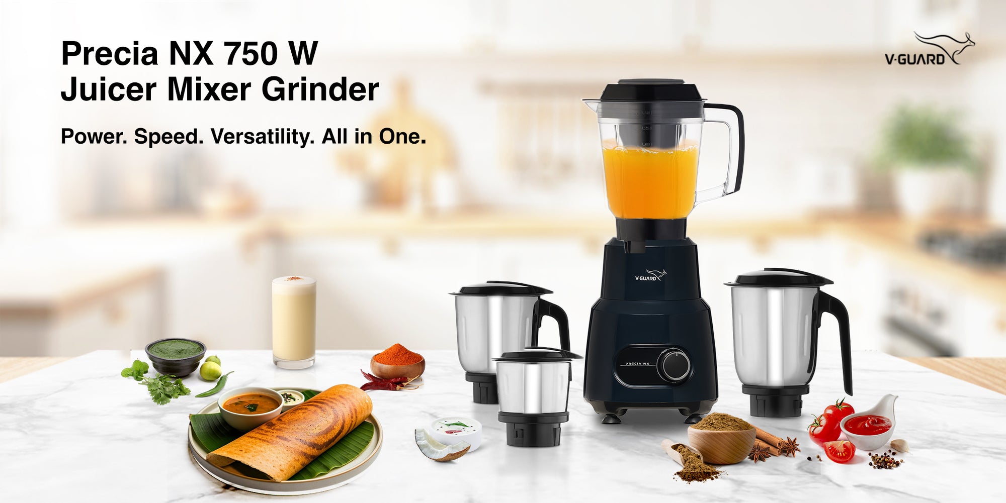 V-Guard Precia NX 750 W Juicer Mixer Grinder | 3-Year Motor Coverage | 4 Versatile Jars | Juicer, Large, Medium & Small | Compact ABS Body | SS Rust-Resistant Blades