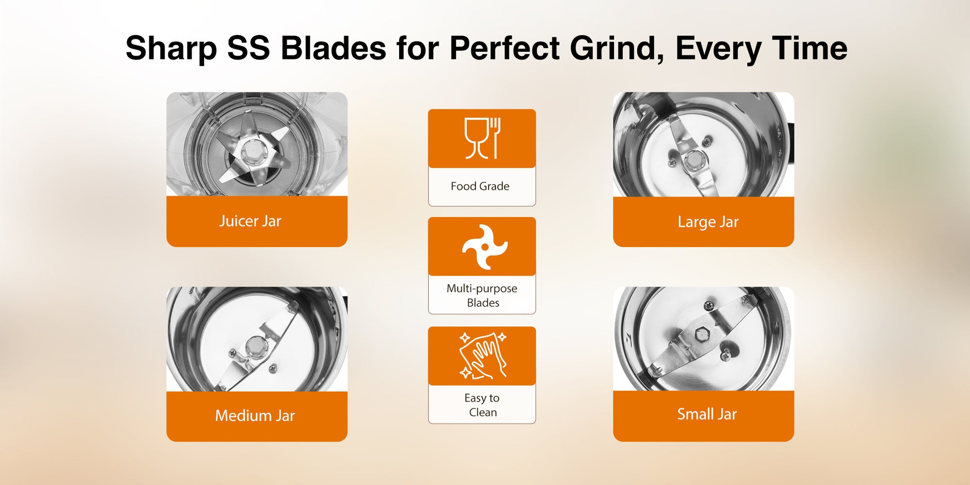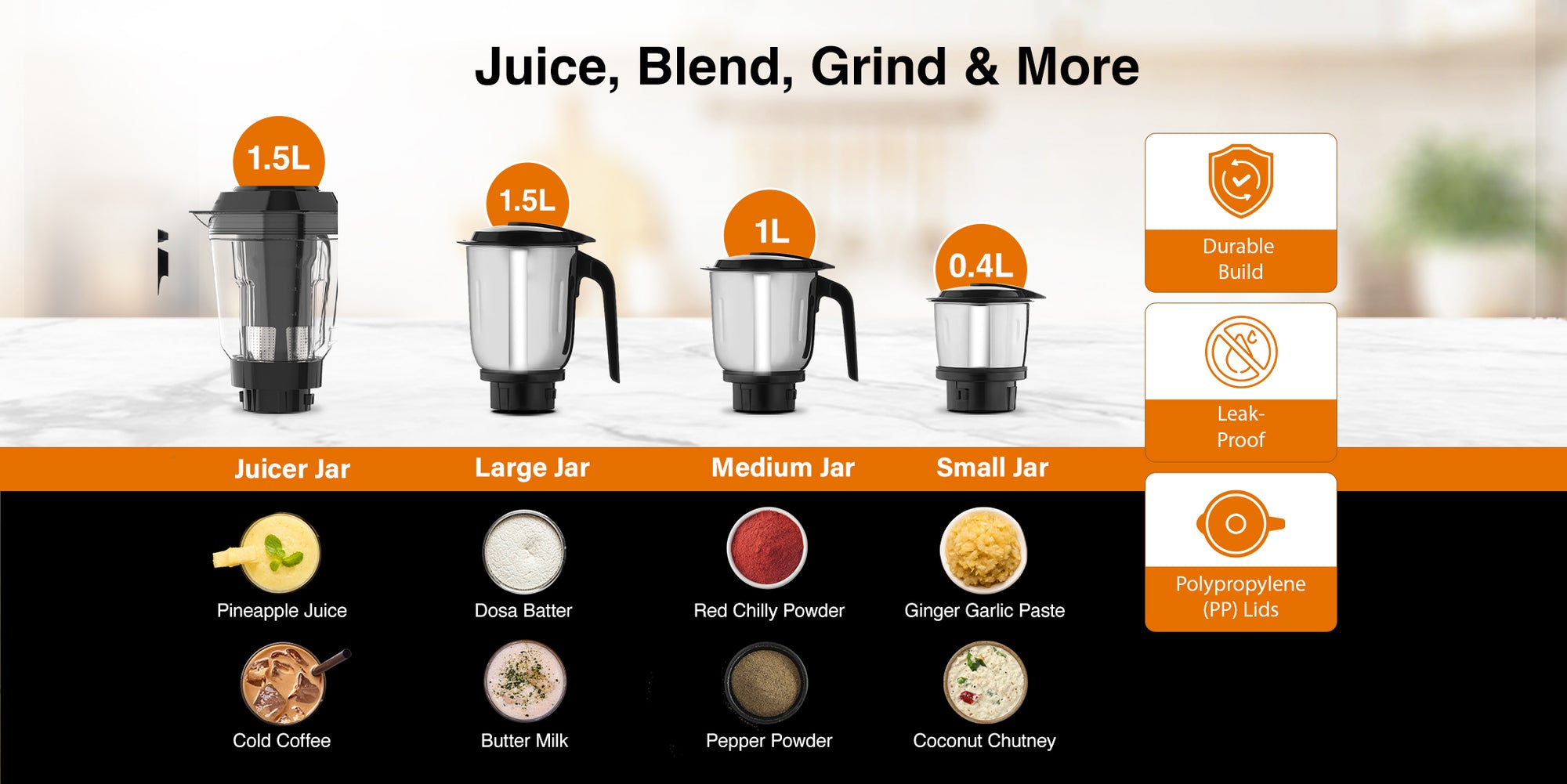 1 NUMBER EACH OF MAIN UNIT, 1.5L JUICER JAR ASSEMBLY WITH PP LID, 1.5L WET GRINDING JAR ASSEMBLY WITH PP LID, 1L DRY GRINDING JAR ASSEMBLY WITH PP LID, 0.4L CHUTNEY JAR ASSEMBLY WITH PP LID & USER MANUAL.