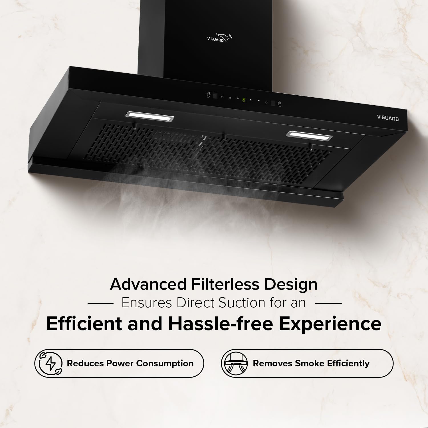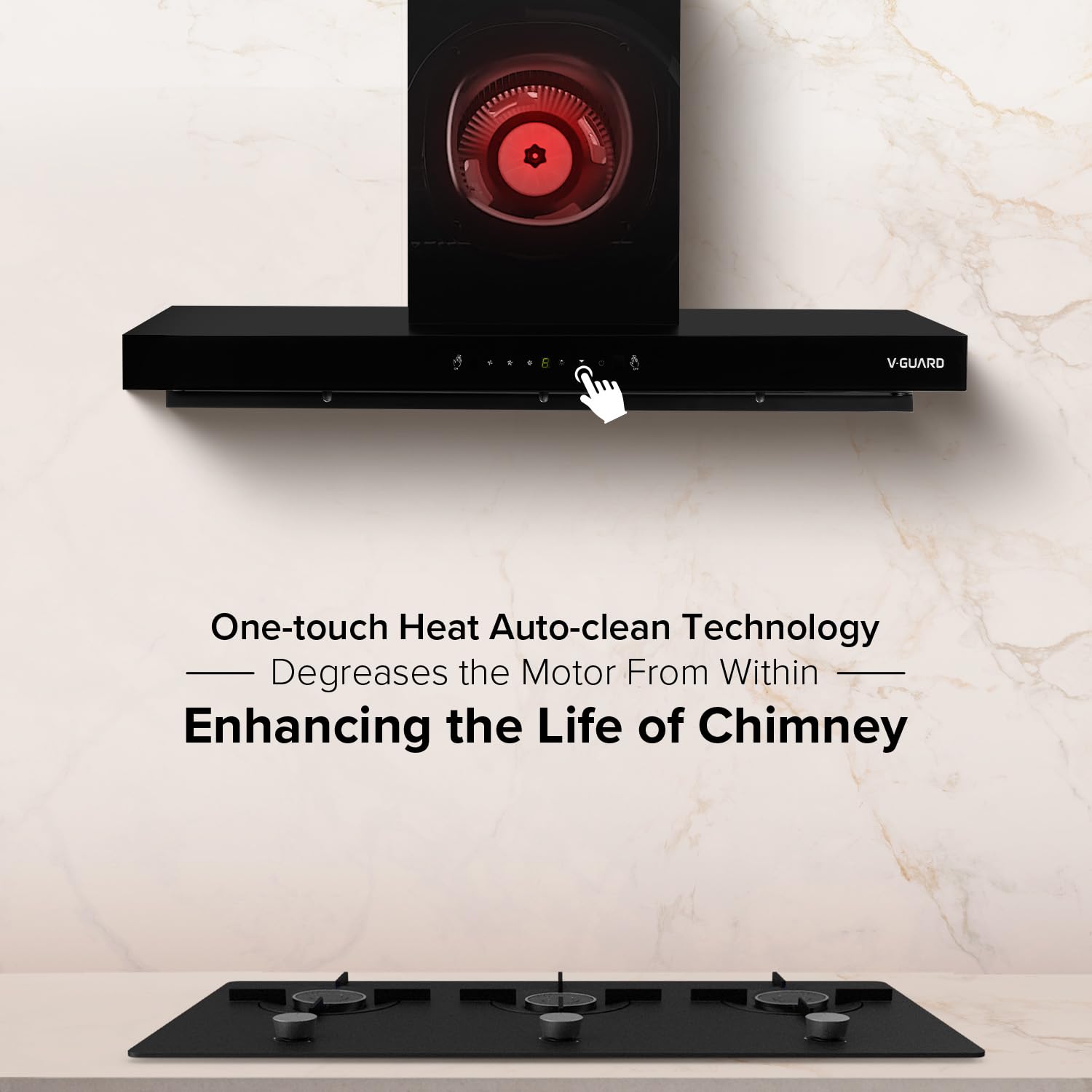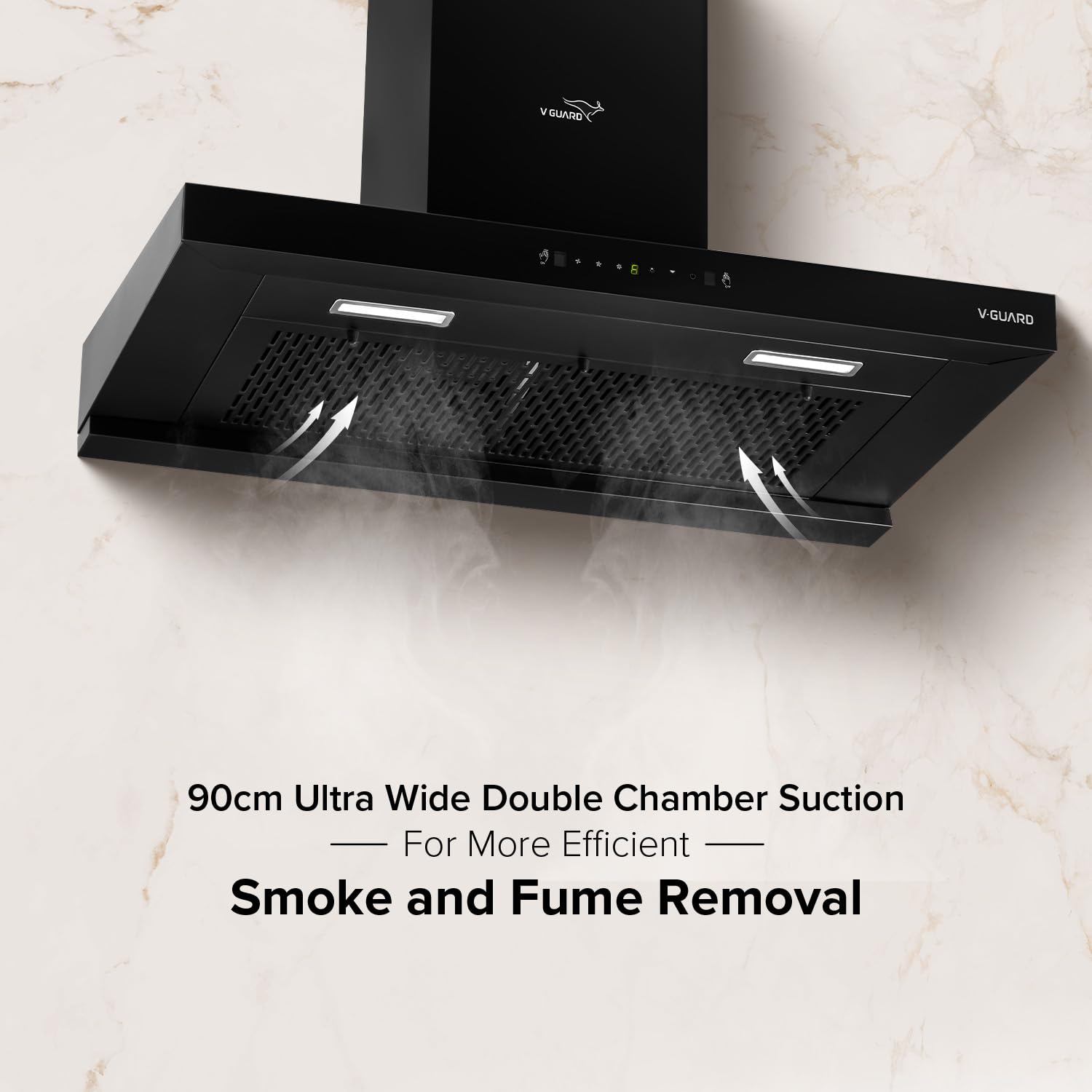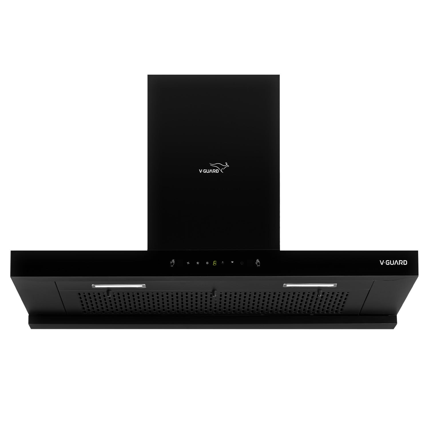 V-Guard T20 90cm Kitchen Chimney | 1300 m³/h Suction Capacity | Intelligent Auto Clean | Filterless | Motion with Touch Control | Wall mounted chimney with Elegant T-Shape Glass Design