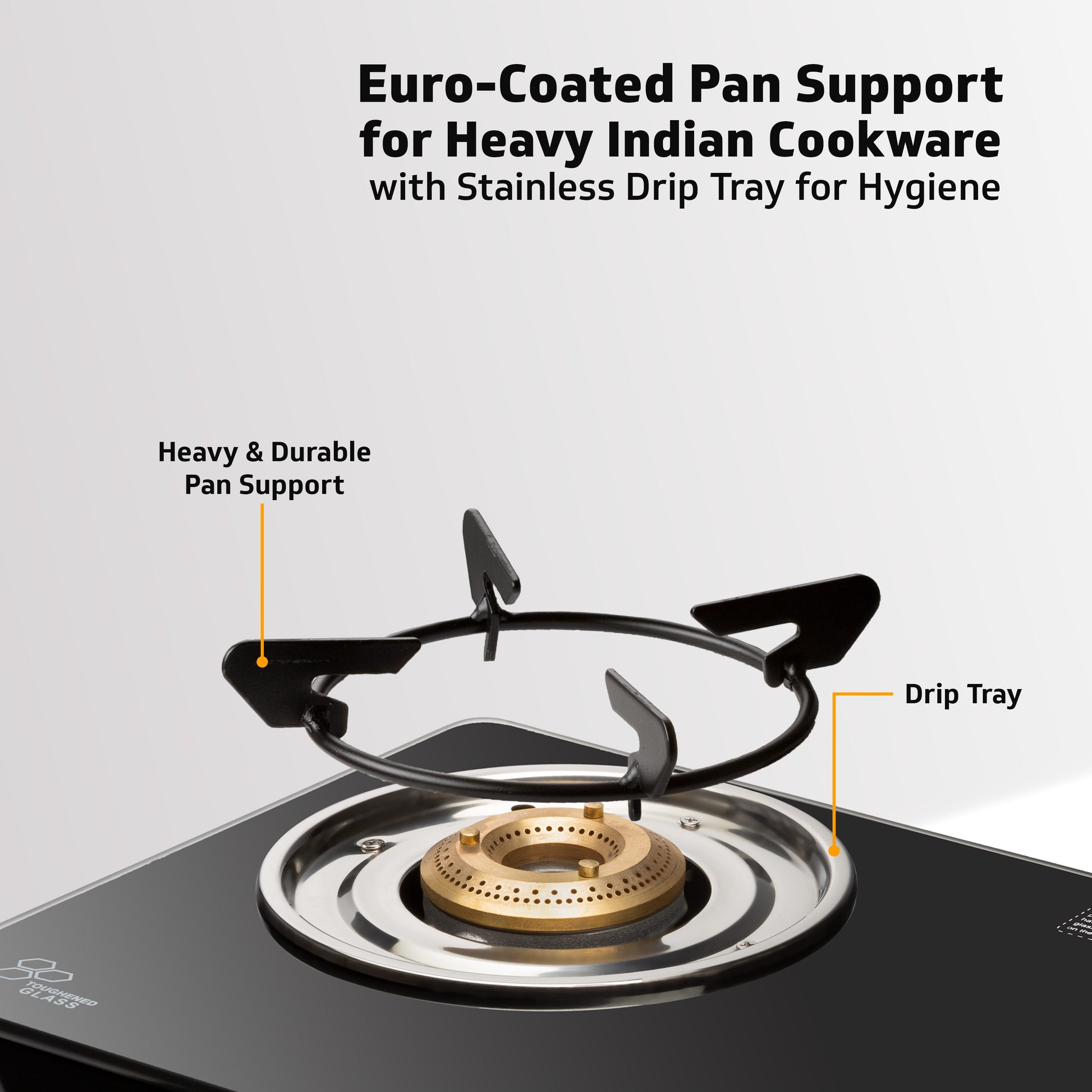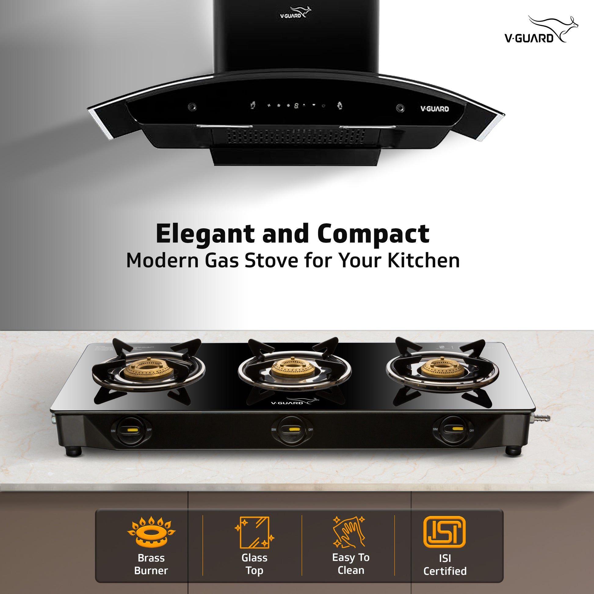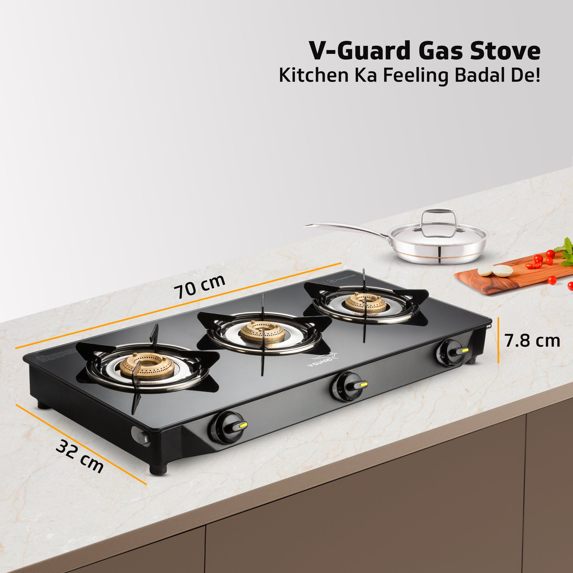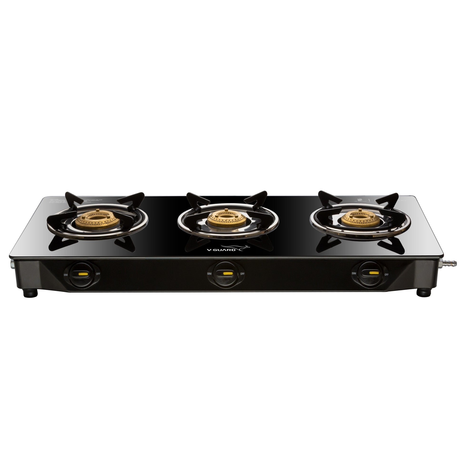 V-Guard VGD 370 PI 3 Burner Gas Stove | Compact & Elegant Gas Stove | 1 Large, 1 Medium & 1 Small High-Efficiency Brass Burner | Toughened Glass Top | 1 Year Coverage by V-Guard