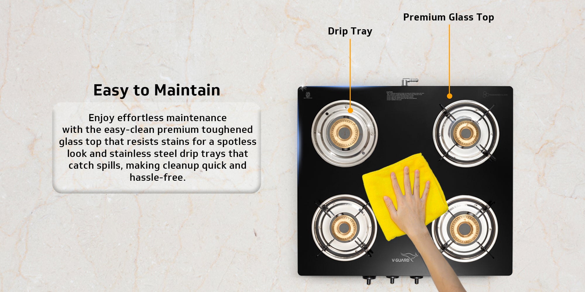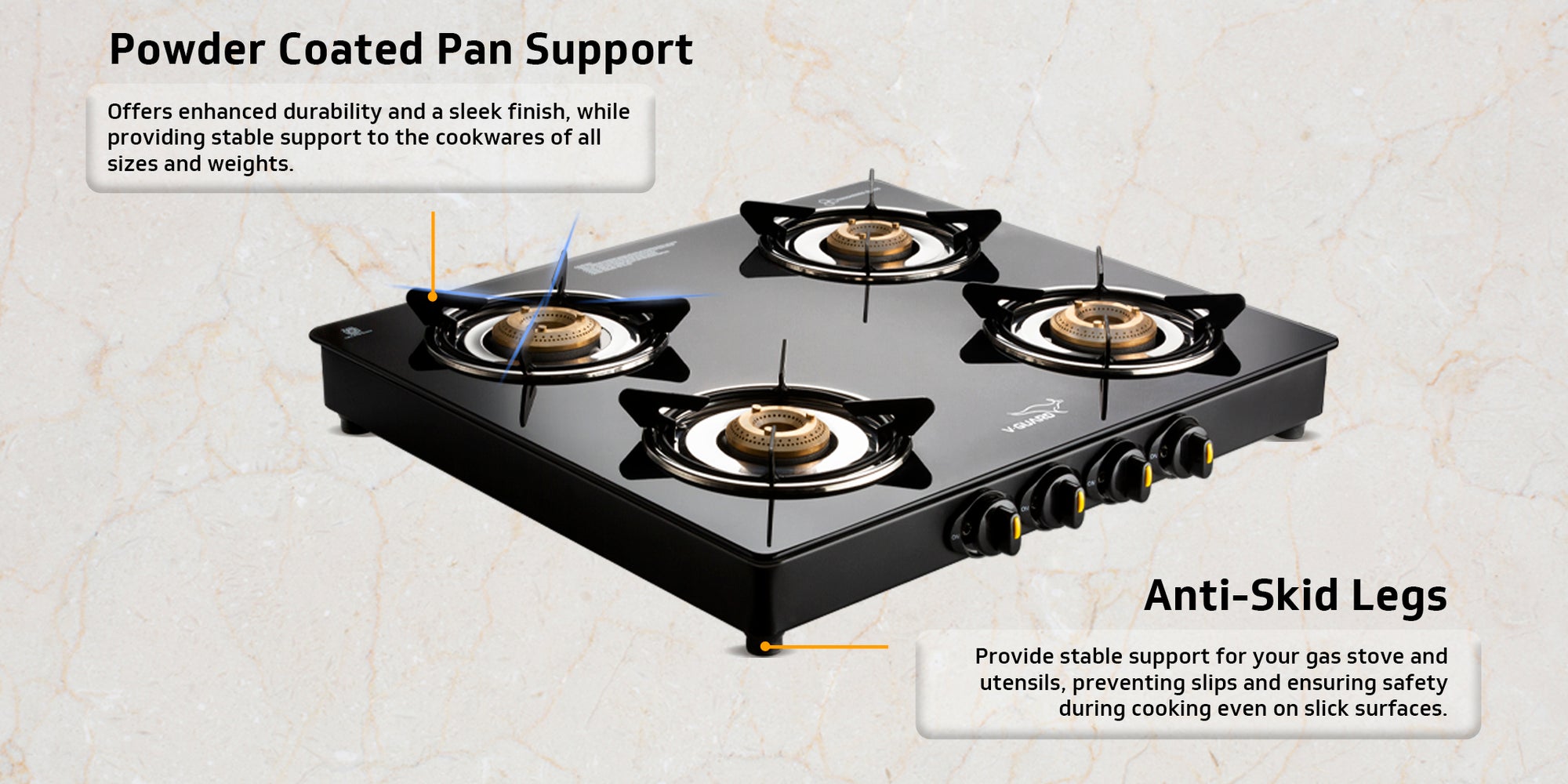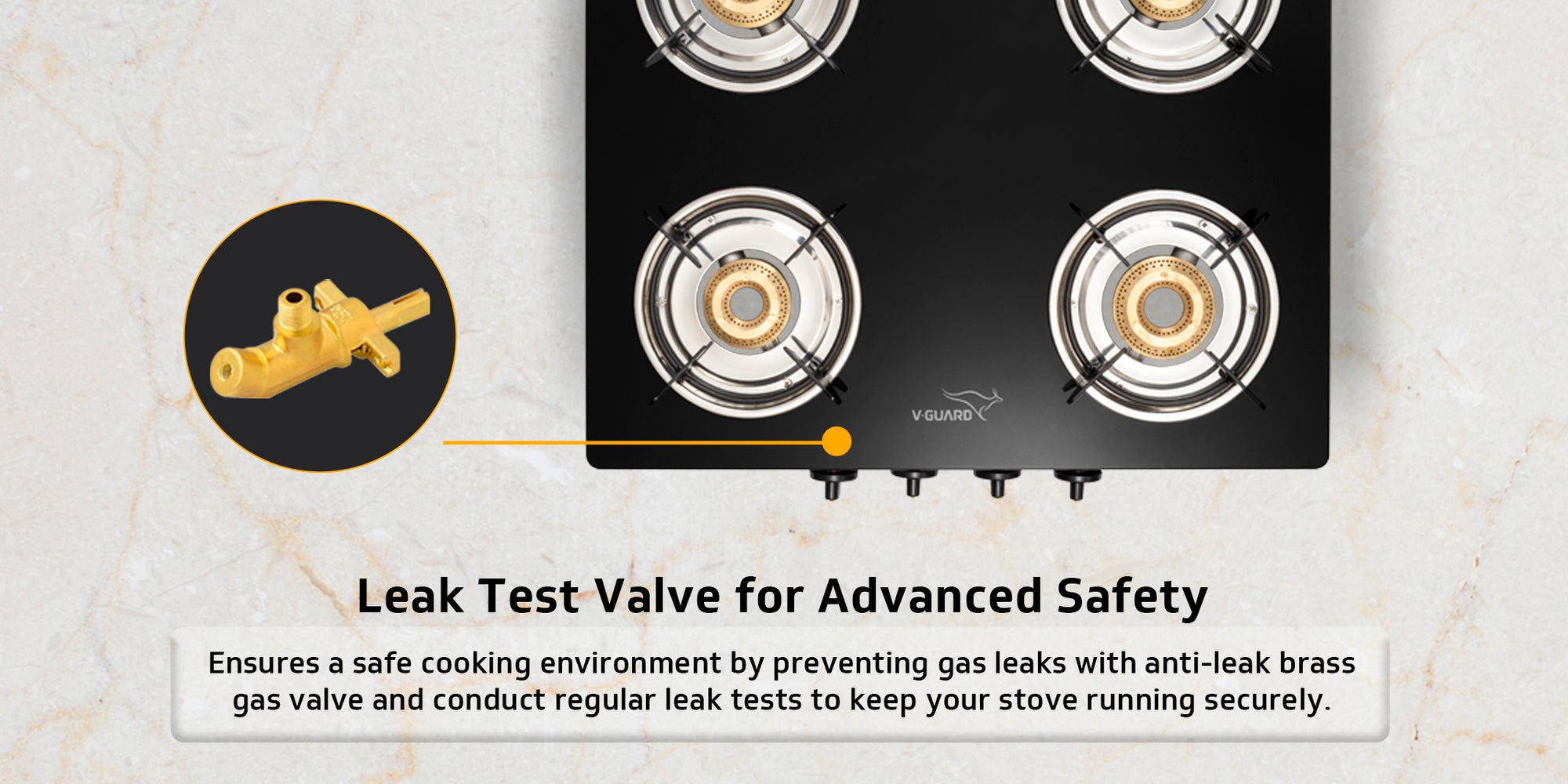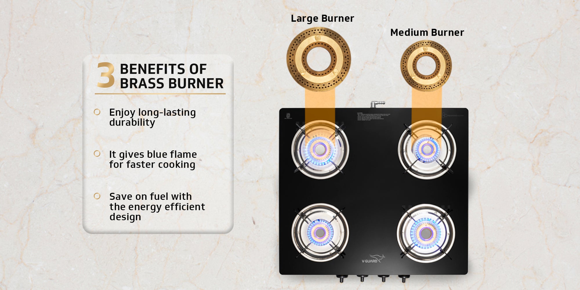 V-Guard VGD 457 PI 4 Burner Gas Stove | Compact & Elegant Gas Stove | 2 Large and 2 Medium High-Efficiency Brass Burners | Toughened Glass Top | 1 Year Coverage by V-Guard