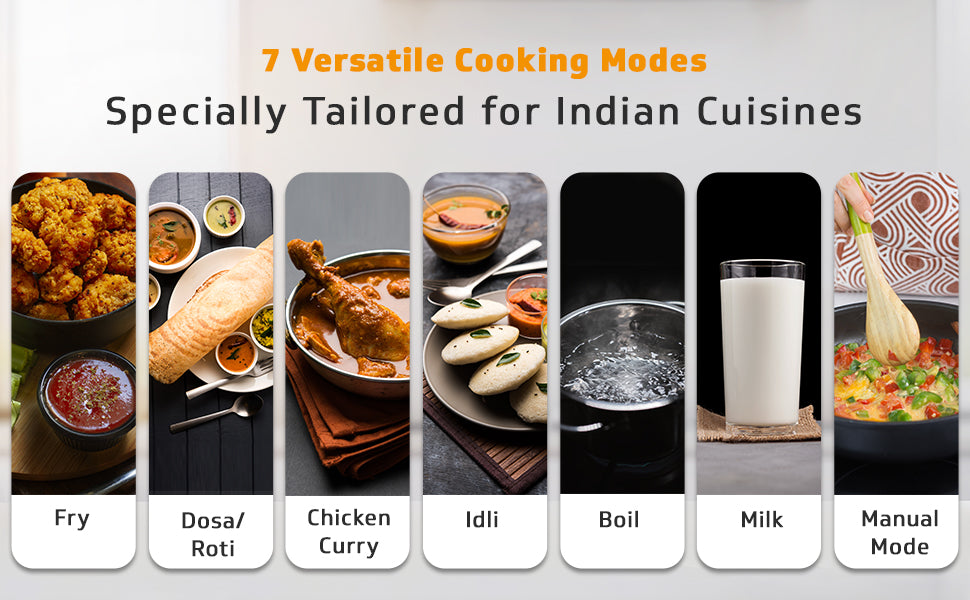Rediscover the joy of cooking with this elegant and resourceful cooking appliance that is sure to meet all your cooking needs while adding a lot of grace to your kitchen décor. The VIC 1.2 Induction cooktop comes with 7 pre-programmed cooking modes – Milk, Boil, Dosa/Chapati, Idli, and Curry – suitable for automatic cooking and 2 manual cooking modes – Deep Fry and Manual – ideal for custom cooking. It also features a 4-hour timer function and a 24-hour Preset function. The timer function ...