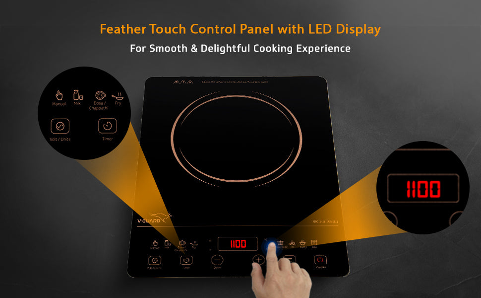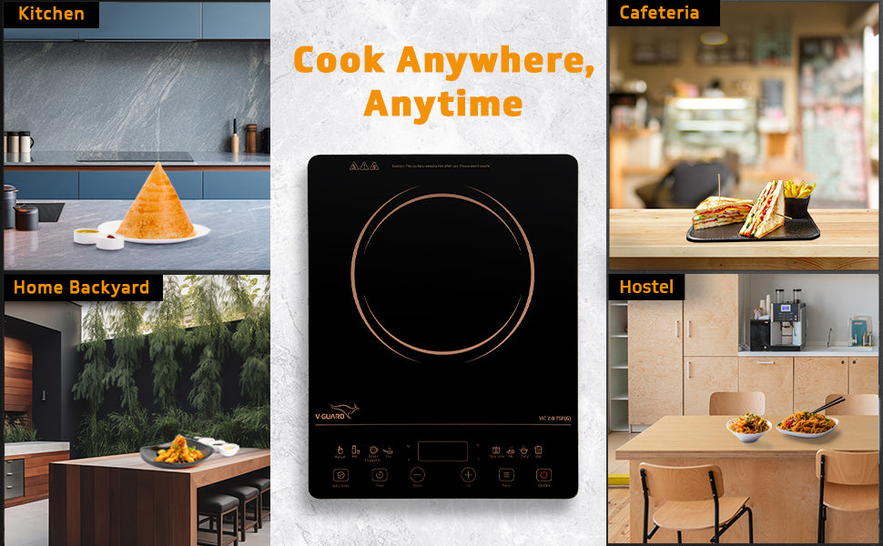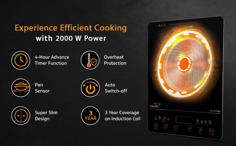 Cook fast and effortlessly with the V-Guard 2.0 TSP(G) Induction Cooktop with 2000 W high power performance. Just 41 mm thick, the slim and elegant design of the electric stove effortlessly fits into any kitchen, making cooking stylish and clutter-free. It's perfect for Indian cuisines, offering 10 power (300W-2000W) and temperature modes (60°C-240°C) for precise cooking. Its touch control panel and clear digital display make switching modes a breeze. You can plan your meals in advance wit...