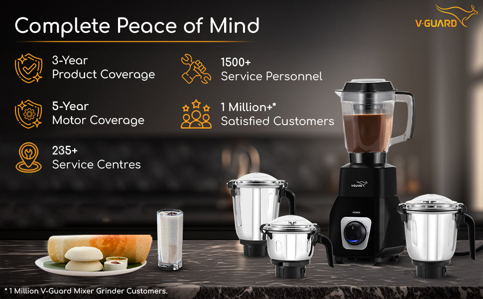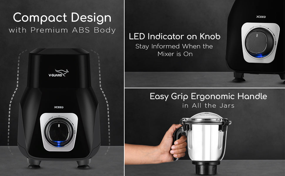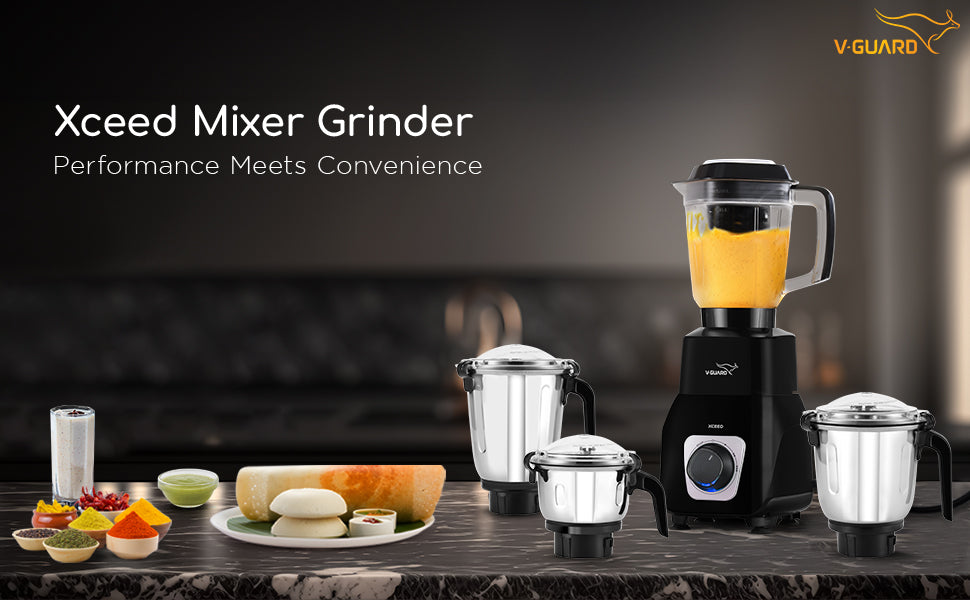 V-Guard Xceed Mixer Grinder 750 Watt with 4 Jars, Lid Locks for Hands-free Operation, Removable Stainless Steel Blades, 2-Year Comprehensive & 3-year Motor Warranty (Black)