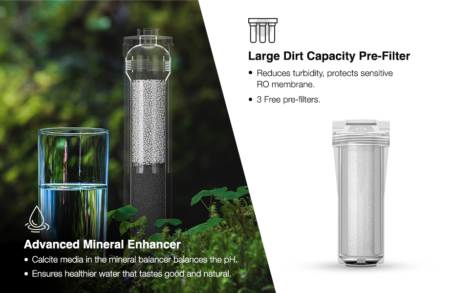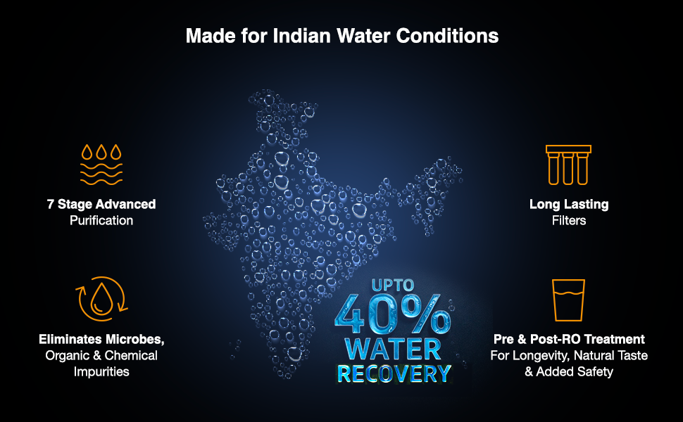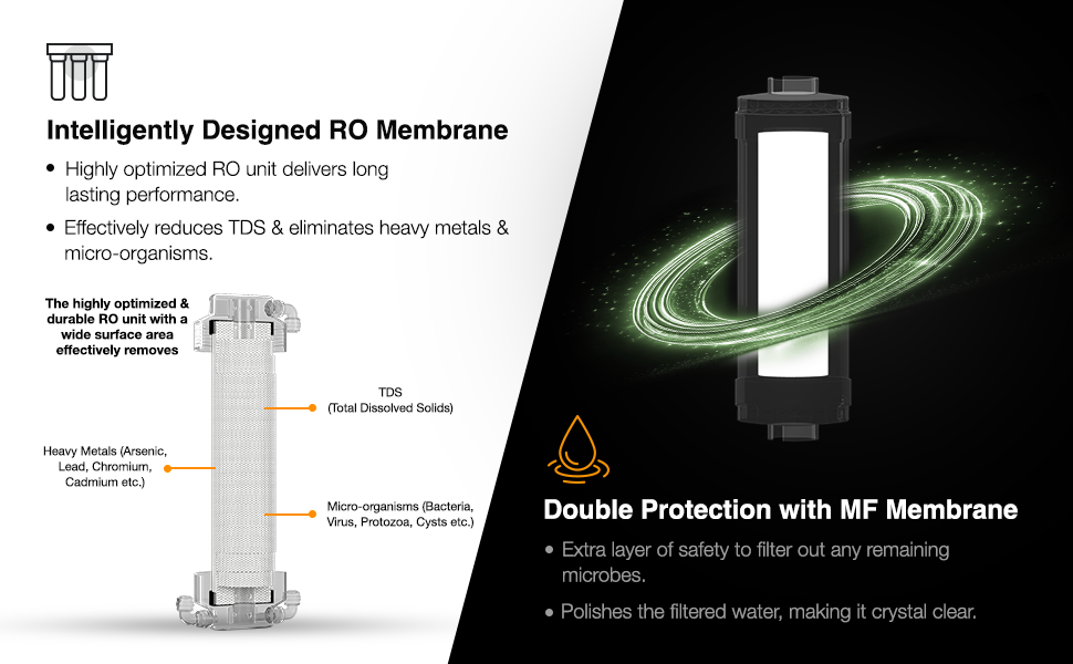 Both variants feature world class RO Membrane and state-of-the-art filters that together form a multi-stage advanced purification process to effectively eliminate micro-organisms, organic & chemical impurities and other similar impure substances so commonly found in Indian water supply. A strong Pre-RO stage comprising of external pre-filter, anti-microbial pre-carbon GAC filter and sediment filter pre-treats the water before it enters the sensitive RO membrane thus protecting it and enhancing its life. In the Post-RO Stage an extra layer of protection is provided through Next generation UV chamber or Hollow Fiber Advanced UF Membrane, while the unique calcite media balances the pH levels of the RO treated water thus reviving its natural taste.