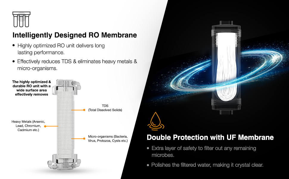 Both variants feature world class RO Membrane and state-of-the-art filters that together form a multi-stage advanced purification process to effectively eliminate micro-organisms, organic & chemical impurities and other similar impure substances so commonly found in Indian water supply. A strong Pre-RO stage comprising of external pre-filter, anti-microbial pre-carbon GAC filter and sediment filter pre-treats the water before it enters the sensitive RO membrane thus protecting it and enhancing its life. In the Post-RO Stage an extra layer of protection is provided through Next generation UV chamber or Hollow Fiber Advanced UF Membrane, while the unique calcite media balances the pH levels of the RO treated water thus reviving its natural taste.