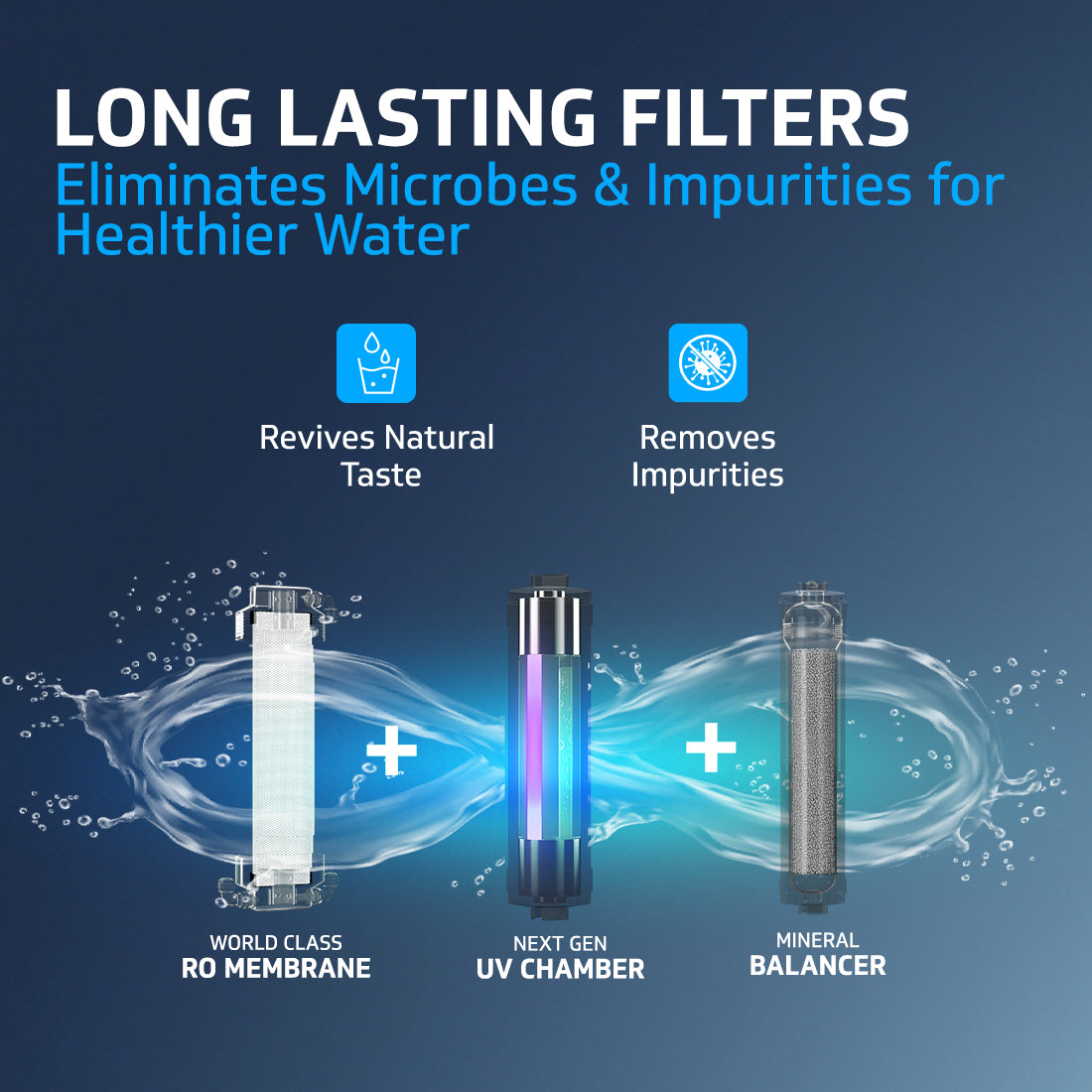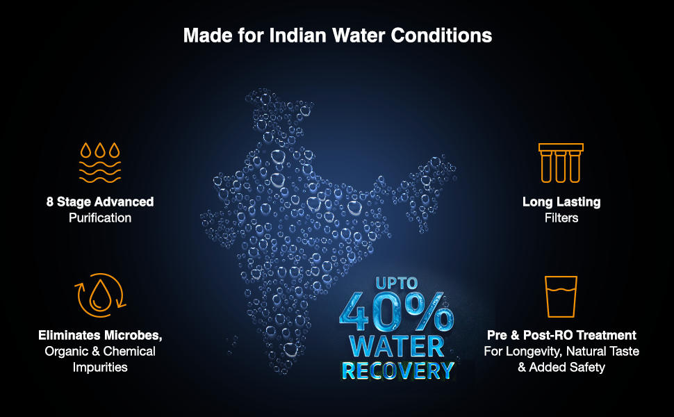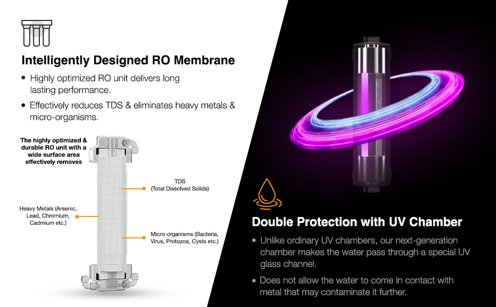 Both variants feature world class RO Membrane and state-of-the-art filters that together form a multi-stage advanced purification process to effectively eliminate micro-organisms, organic & chemical impurities and other similar impure substances so commonly found in Indian water supply. A strong Pre-RO stage comprising of external pre-filter, anti-microbial pre-carbon GAC filter and sediment filter pre-treats the water before it enters the sensitive RO membrane thus protecting it and enhancing its life. In the Post-RO Stage an extra layer of protection is provided through Next generation UV chamber or Hollow Fiber Advanced UF Membrane, while the unique calcite media balances the pH levels of the RO treated water thus reviving its natural taste.