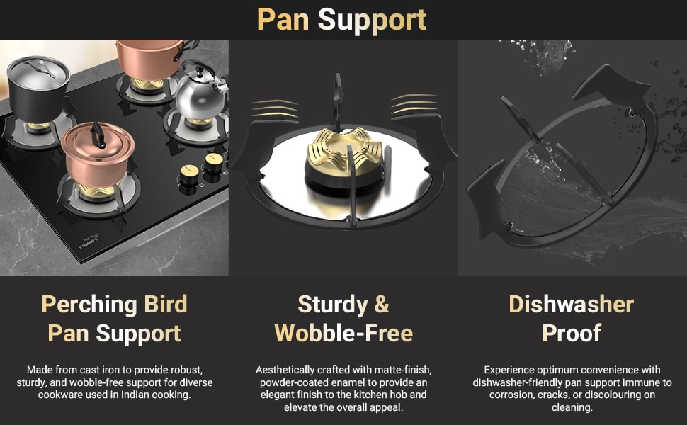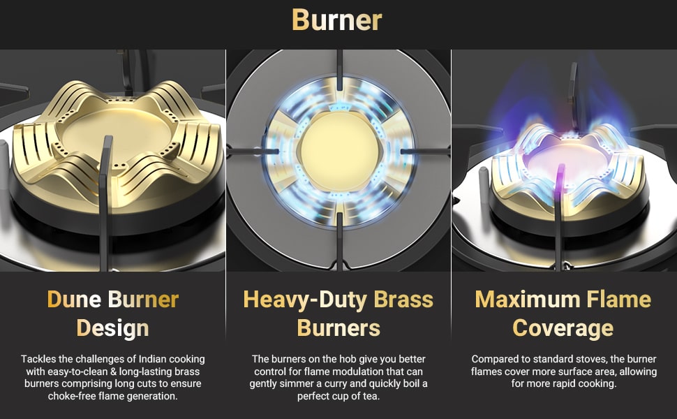 V-Guard VHD 360 AGR Kitchen hob is an ideal Indian hobtop. Be it withstanding the demanding flames of a masala tadka, or the slow even-flamed simmer of your favourite lip-smacking kheer, VHD 360 AGR comes with brass burners boasting unique Dune design and multiple flame modulations, make it a perfect fit for Indian cooking needs. The oil-laden and high quantity food preparations of an Indian kitchen are delicious, but the dishwasher-safe powder enamel-coated Perching Bird pan support provi...