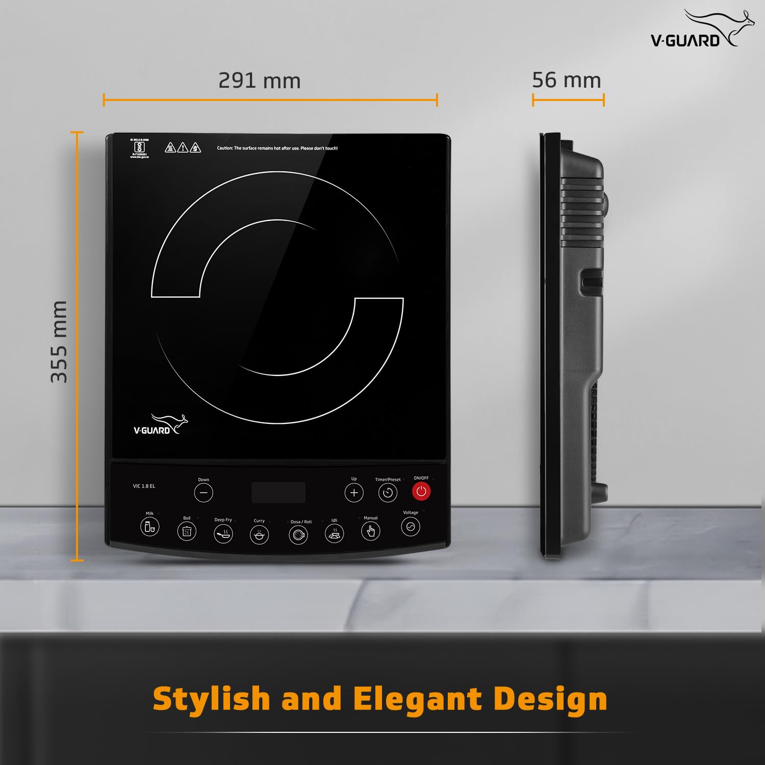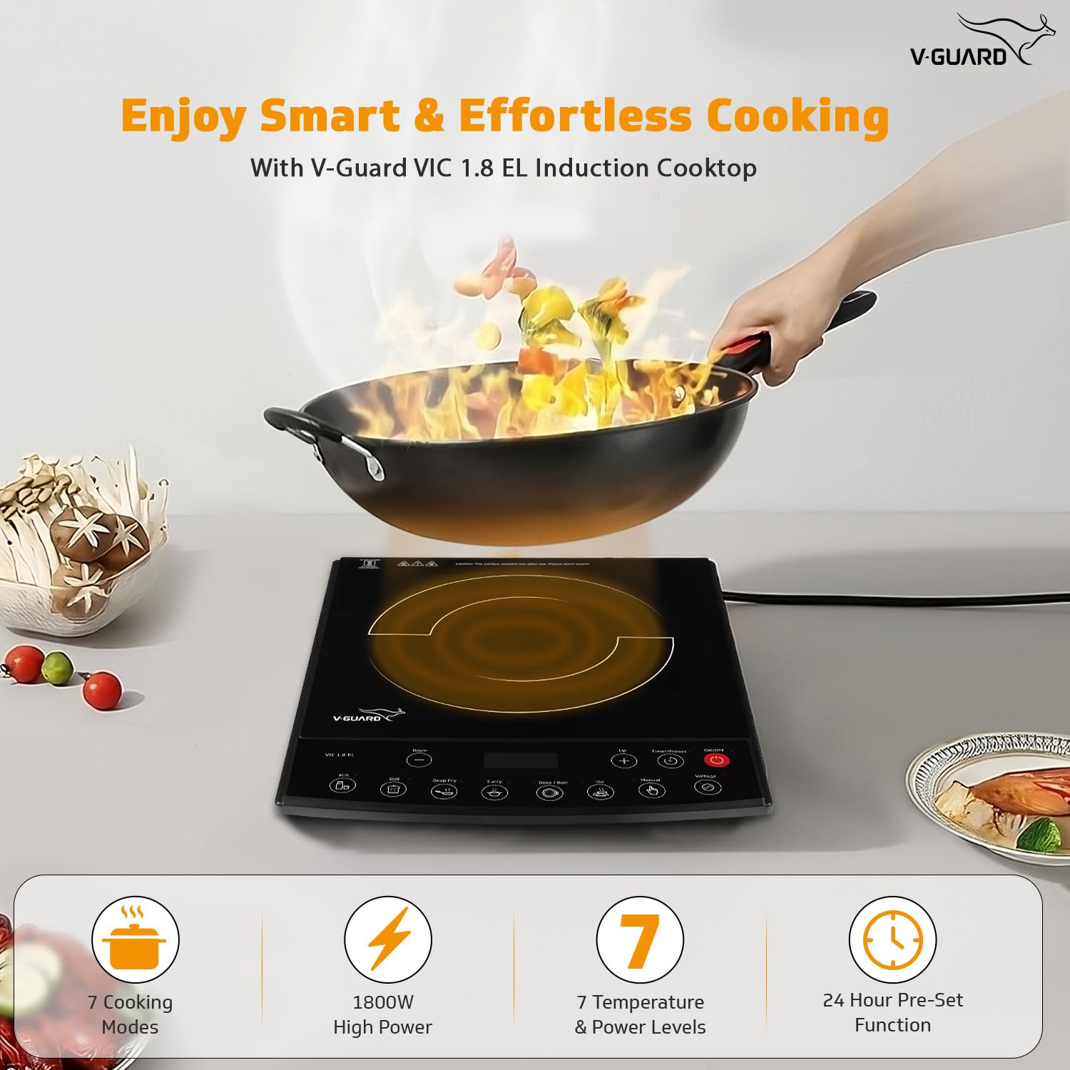 Introducing VIC 1.8 EL: Effortless Cooking with Style and Convenience. Experience fast and even cooking like never before with VIC 1.8 EL. Powered by a range of 120 W - 1800 W, this sleek induction cooktop ensures your meals are prepared quickly and evenly, making it the perfect companion for your culinary adventures. Designed with Indian cooking in mind, VIC 1.8 EL comes equipped with 4 pre-programmed cooking menus: Boil, Dosa/Roti, Idli, and Curry. Additionally, it offers 2 manual functi...
