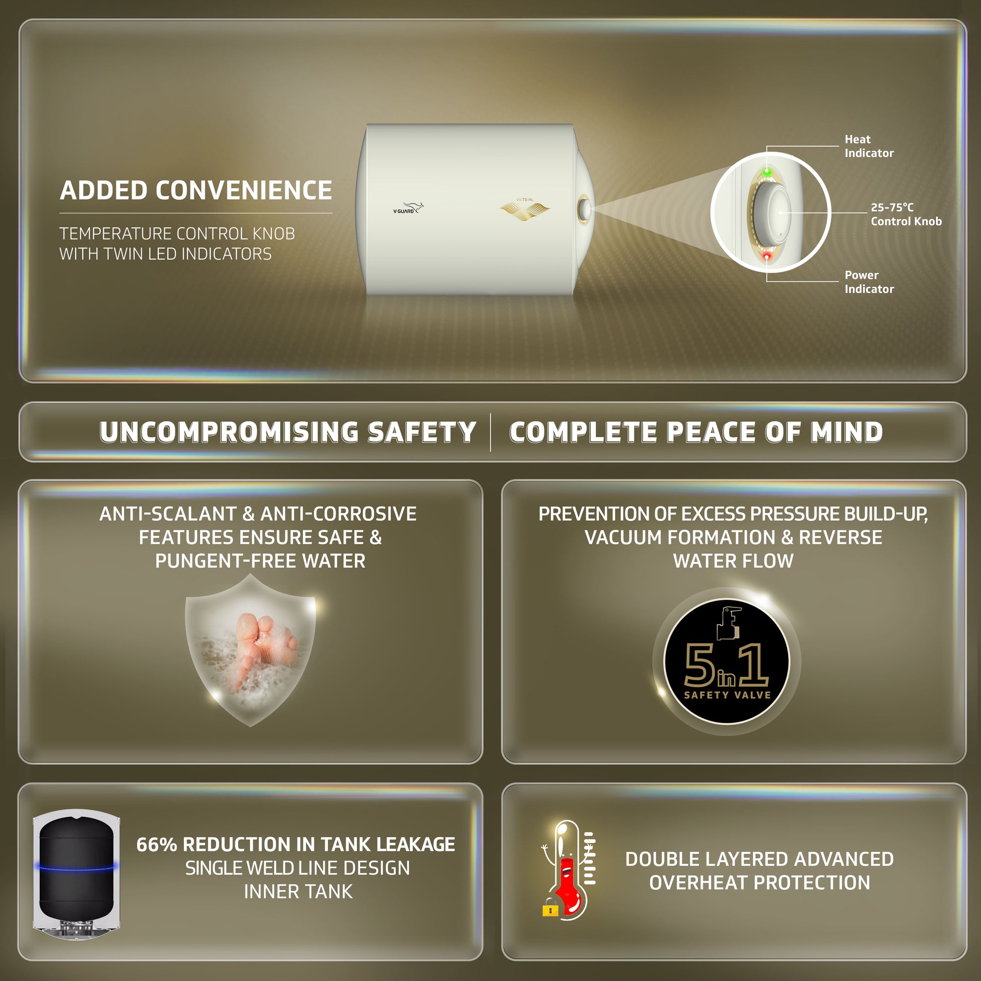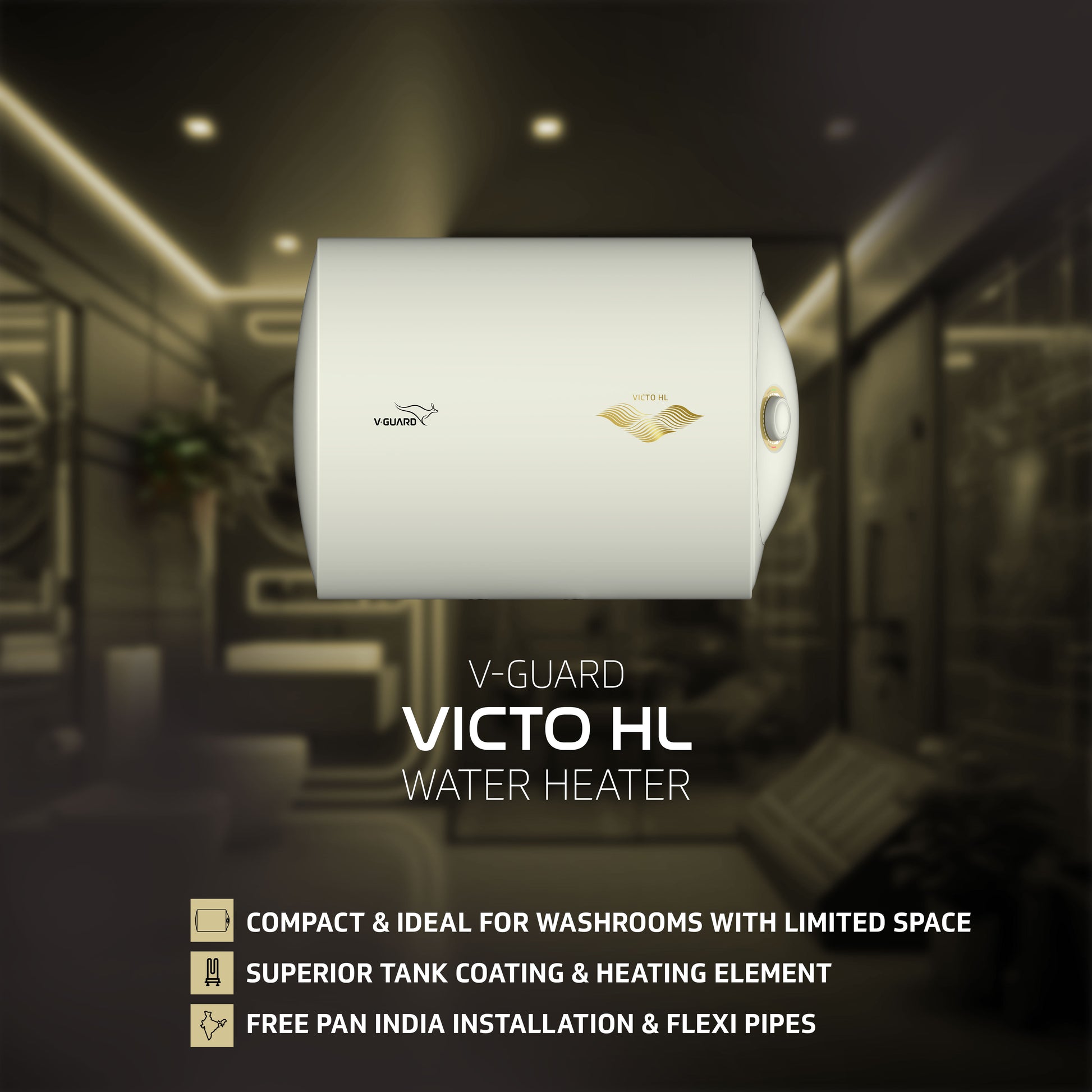 A seamless blend of extreme durability and higher energy savings, the all-new Victo HL Horizontal Water Heater makes for a perfect addition to your bathroom. Victo HL comes with a thick and high-density PUF insulation that helps maximise heat retention and ensures that the inside water remains heated for a longer duration, thereby bringing down energy consumption and reducing your electricity bills. It has a 3-Star Rating from BEE. Its ability to withstand water pressure up to 8 bar also m...