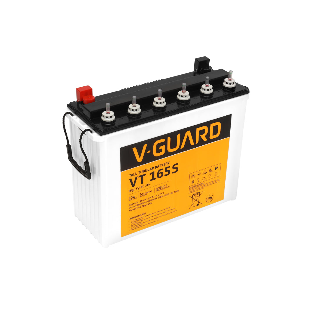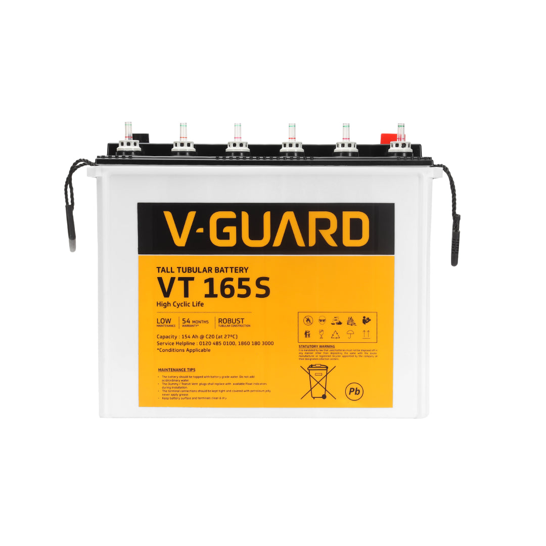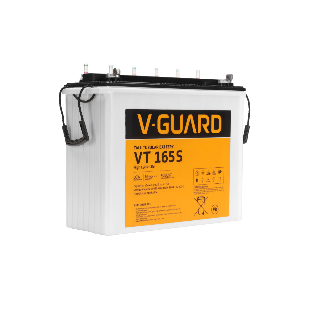 The V-Guard VT 165S is a high-performance tubular inverter battery designed to provide reliable and long-lasting power backup for your home. With a capacity of 154Ah at C20, it ensures efficient performance and durability, making it compatible with inverters ranging from 300 to 1000VA. Engineered to handle high power demands, it offers dependable backup during power outages while maintaining steady performance.