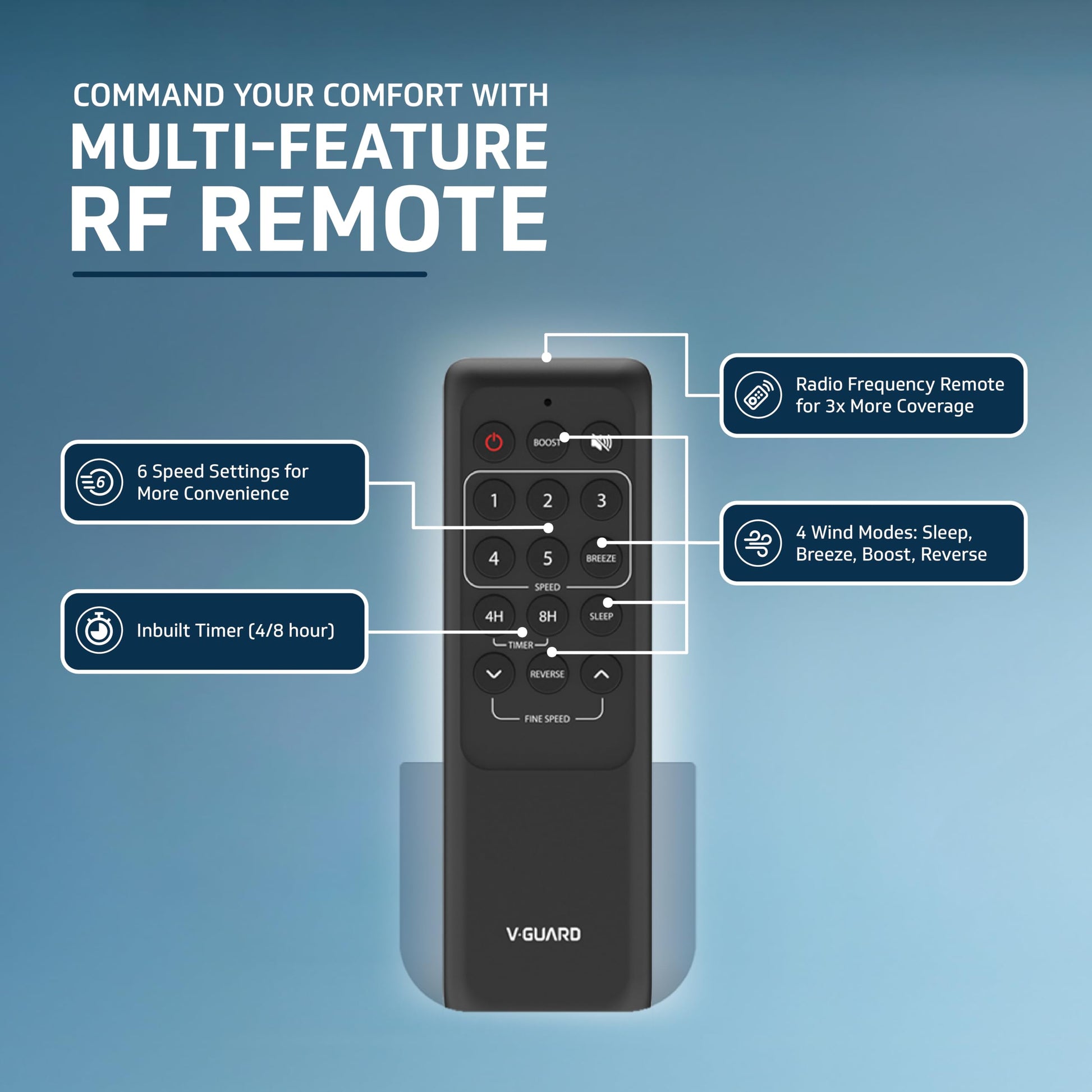 V-Guard Windle Deco BLDC Ceiling Fan for home, designed for superior performance and energy efficiency. Featuring a powerful 380 RPM motor and delivering 220 m³/min of airflow, this fan ensures optimal comfort in any room. With its BEE 5-Star rating and 35-watt BLDC motor, it provides upto 53% energy savings as compared to any other conventional fan. Enjoy the convenience of a remote controller with an 8-hour customizable timer and four wind modes: sleep, breeze, boost, and reverse. Its mo...